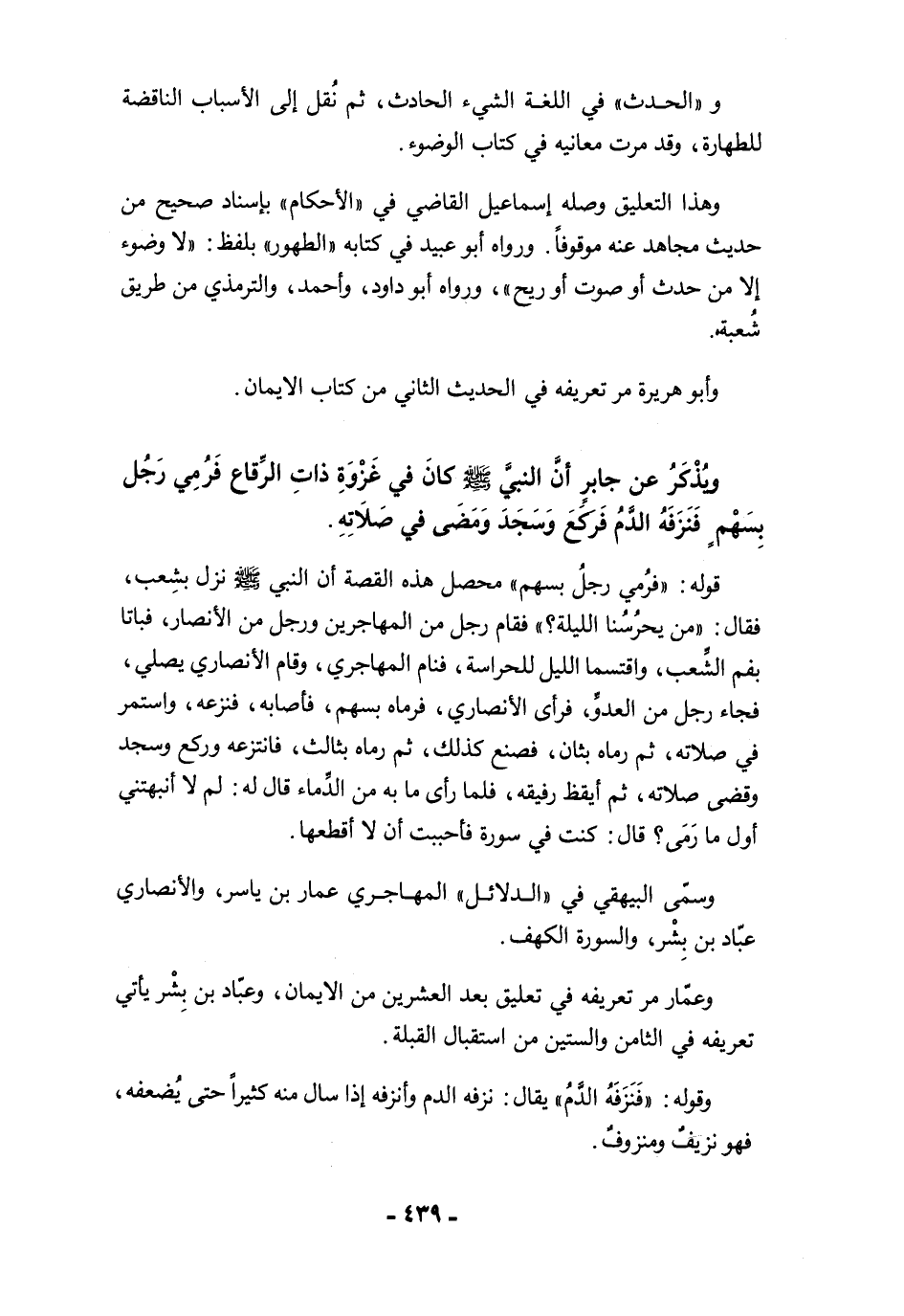 ويُذْكَرُ عن جابرٍ أنَّ النبيَّ -صلى الله عليه وسلم- كانَ في غَزْوَةِ ذاتِ الرِّقاع فَرُمِي رَجُل بِسَهْمٍ فَنَزَفَهُ الدَّمُ فَركَعَ وَسَجَدَ وَمَضَى في صَلَاتِهِ.
