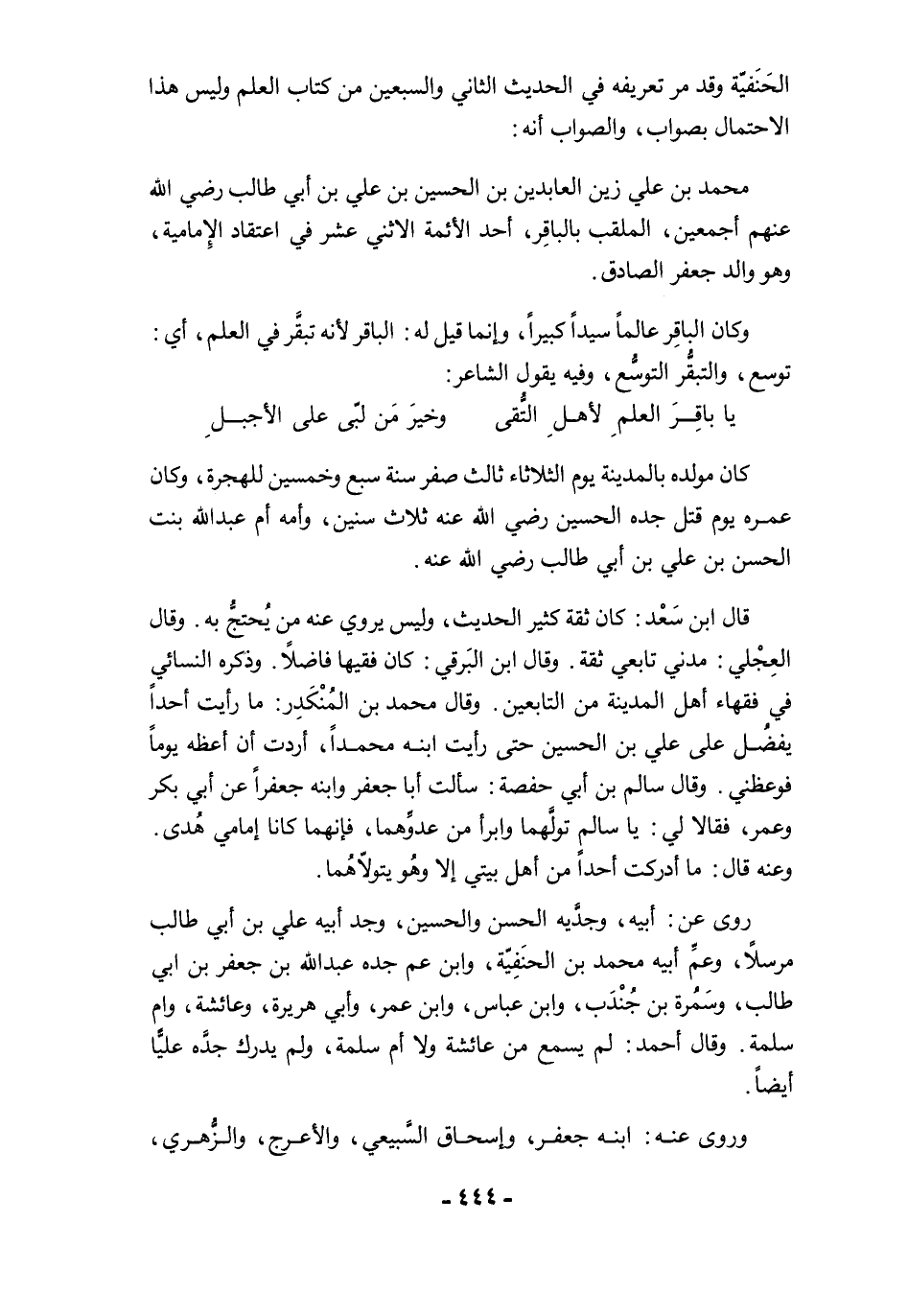 وكان الباقِر عالمًا سيدًا كبيرًا، وإنما قيل له: الباقر لأنه تبقَّر في العلم، أي: توسع، والتبقُّر التوسُّع، وفيه يقول الشاعر: