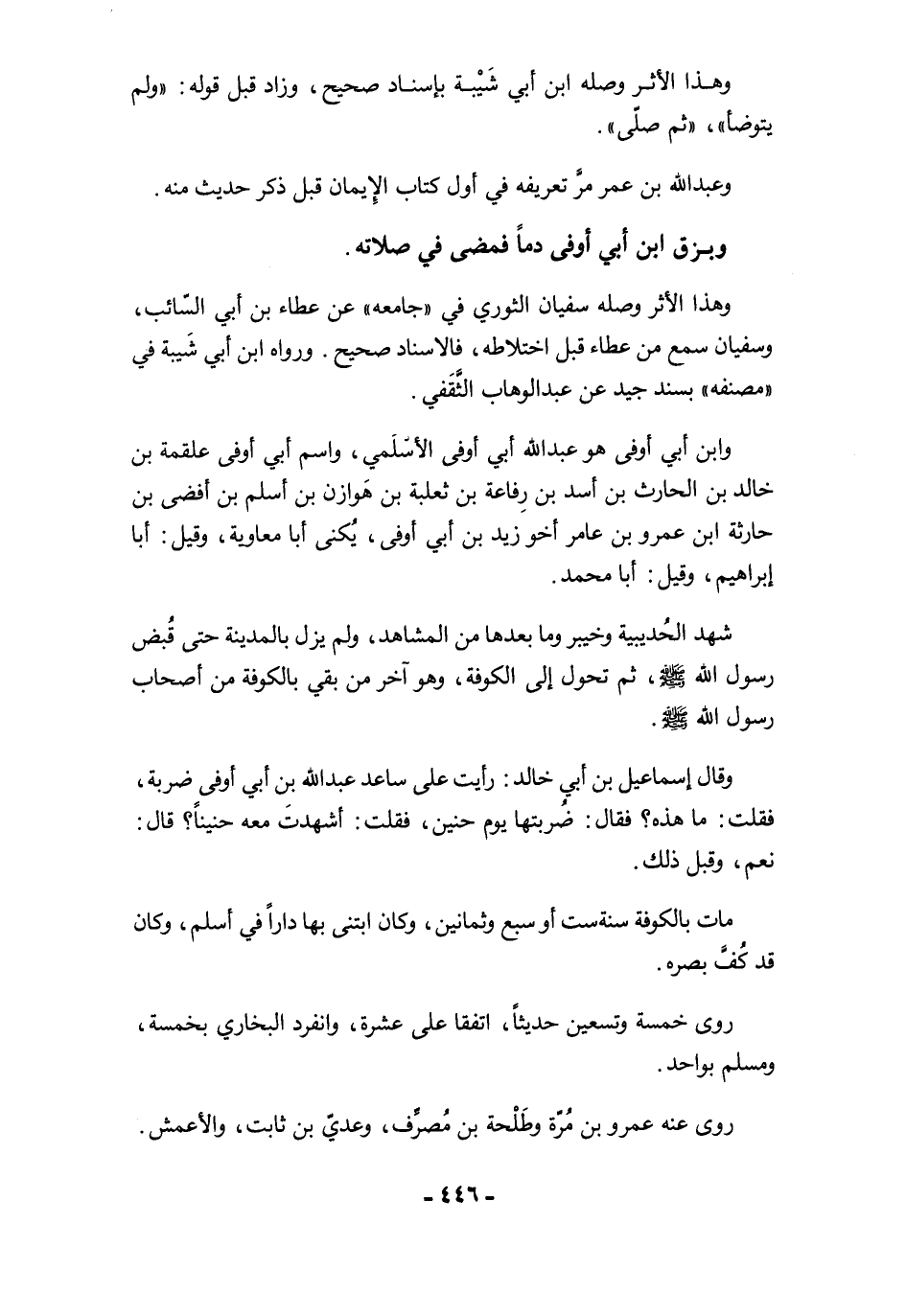 وقال إسماعيل بن أبي خالد: رأيت على ساعد عبد الله بن أبي أوفى ضربة، فقلت: ما هذه؟ فقال: ضربتها يوم حنين، فقلت: أشهدتَ معه حنينًا؟ قال: نعم، وقبل ذلك.