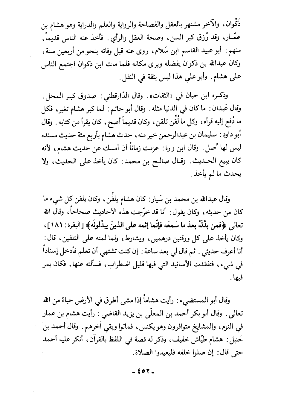 وذكره ابن حبان في "الثقات". وقال الدّارقطني: صدوق كبير المحل. وقال عَبدان: ما كان في الدنيا مثله. وقال أبو حاتم: لما كبر هشام تغير، فكل ما دُفع إليه قرأه، وكل ما لُقِّن تلقن، وكان قديمًا أصح، كان يقرأ من كتابه. وقال أبو داود: سليمان بن عبد الرحمن خير منه، حدث هشام بأربع مئة حديث مسنده ليس لها أصل. وقال ابن وارة: عزمت زمانًا أن أمسك عن حديث هشام, لأنه كان يبيع الحديث. وقال صالح بن محمد: كان يأخذ على الحديث، ولا يحدث ما لم يأخذ.