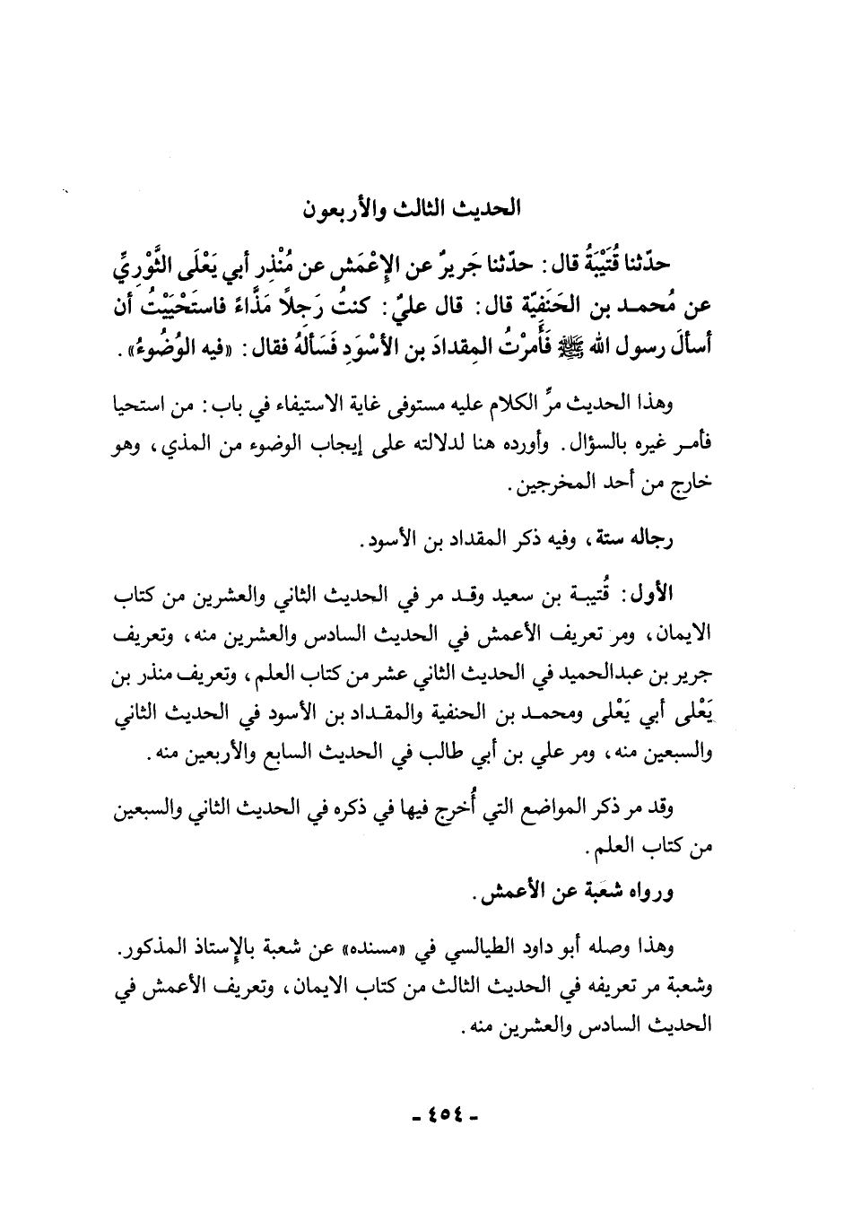 الأول: قُتيبة بن سعيد وقد مر في الحديث الثاني والعشرين من كتاب الإيمان، ومر تعريف الأعمش في الحديث السادس والعشرين منه، وتعريف جرير بن عبد الحميد في الحديث الثاني عشر من كتاب العلم، وتعريف منذر بن يَعْلى أبي يَعْلى ومحمد بن الحنفية والمقداد بن الأسود في الحديث الثاني والسبعين منه، ومر علي بن أبي طالب في الحديث السابع والأربعين منه.