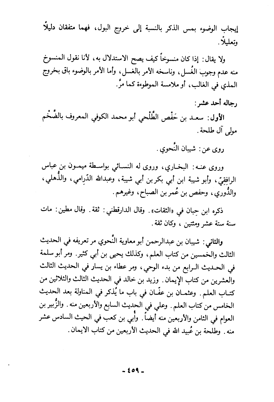 والثاني: شيبان بن عبد الرحمن أبو معاوية النَّحوي مر تعريفه في الحديث الثالث والخمسين من كتاب العلم، وكذلك يحيى بن أبي كثير. ومر أبو سلمة في الحديث الرابع من بدء الوحي، ومر عطاء بن يسار في الحديث الثالث والعشرين من كتاب الإيمان. وزيد بن خالد في الحديث الثالث والثلاثين من كتاب العلم. وعثمان بن عفّان في باب ما يُذكر في المناولة بعد الحديث الخامس من كتاب العلم. وعلي في الحديث السابع والأربعين منه. والزُّبير بن العوام في الثامن والأربعين منه أيضًا. وأبي بن كعب في الحديث السادس عشر منه. وطلحة بن عُبيد الله في الحديث الأربعين من كتاب الإيمان.