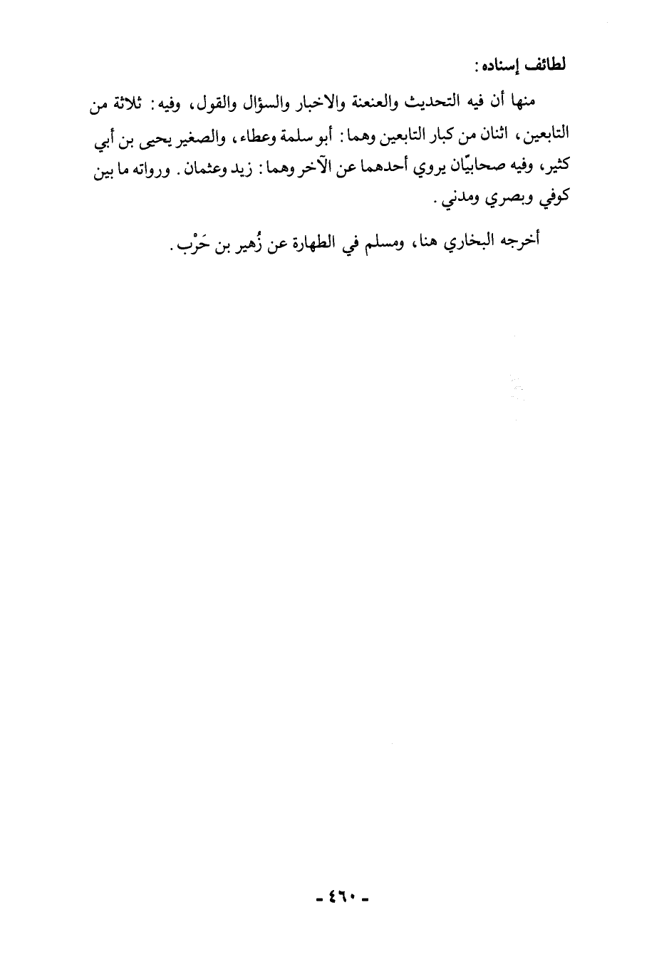 منها أن فيه التحديث والعنعنة والاخبار والسؤال والقول، وفيه: ثلاثة من التابعين، اثنان من كبار التابعين وهما: أبو سلمة وعطاء، والصغير يحيى بن أبي كثير، وفيه صحابيّان يروي أحدهما عن الآخر وهما: زيد وعثمان. ورواته ما بين كوفي وبصري ومدني.