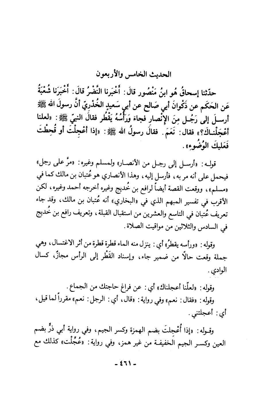 حَدَّثَنَا إِسْحَاقُ هُو ابنُ مَنْصُور قَالَ: أَخْبَرَنَا النَّضْرُ قَالَ: أَخْبَرَنَا شُعْبَةُ عَنِ الْحَكَمِ عَنْ ذَكْوَانَ أَبِي صَالِحٍ عَنْ أَبِي سَعِيدٍ الْخُدْرِيِّ أَنَّ رَسُولَ اللَّهِ -صلى الله عليه وسلم- أَرْسَلَ إِلَى رَجُلٍ مِنَ الأَنْصَارِ فَجَاءَ وَرَأْسُهُ يَقْطُرُ، فَقَالَ النَّبِيُّ -صلى الله عليه وسلم-: "لَعَلَّنَا أَعْجَلْنَاكَ؟ ". فَقَالَ: نَعَمْ. فَقَالَ رَسُولُ اللَّهِ -صلى الله عليه وسلم-: "إِذَا أُعْجِلْتَ أَوْ قُحِطْتَ، فَعَلَيْكَ الْوُضُوءُ".