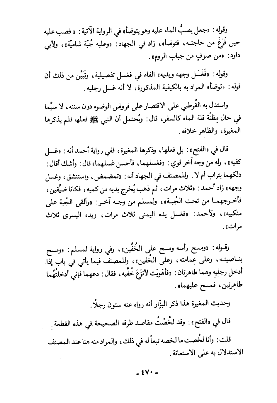 واستدل به القُرطبي على الاقتصار على فروض الوضوء دون سننه، لاسيَّما في حال مِظنّة قلة الماء كالسفر، قال: ويُحتمل أن النبي -صلى الله عليه وسلم- فعلها فلم يذكرها المغيرة، والظاهر خلافه.
