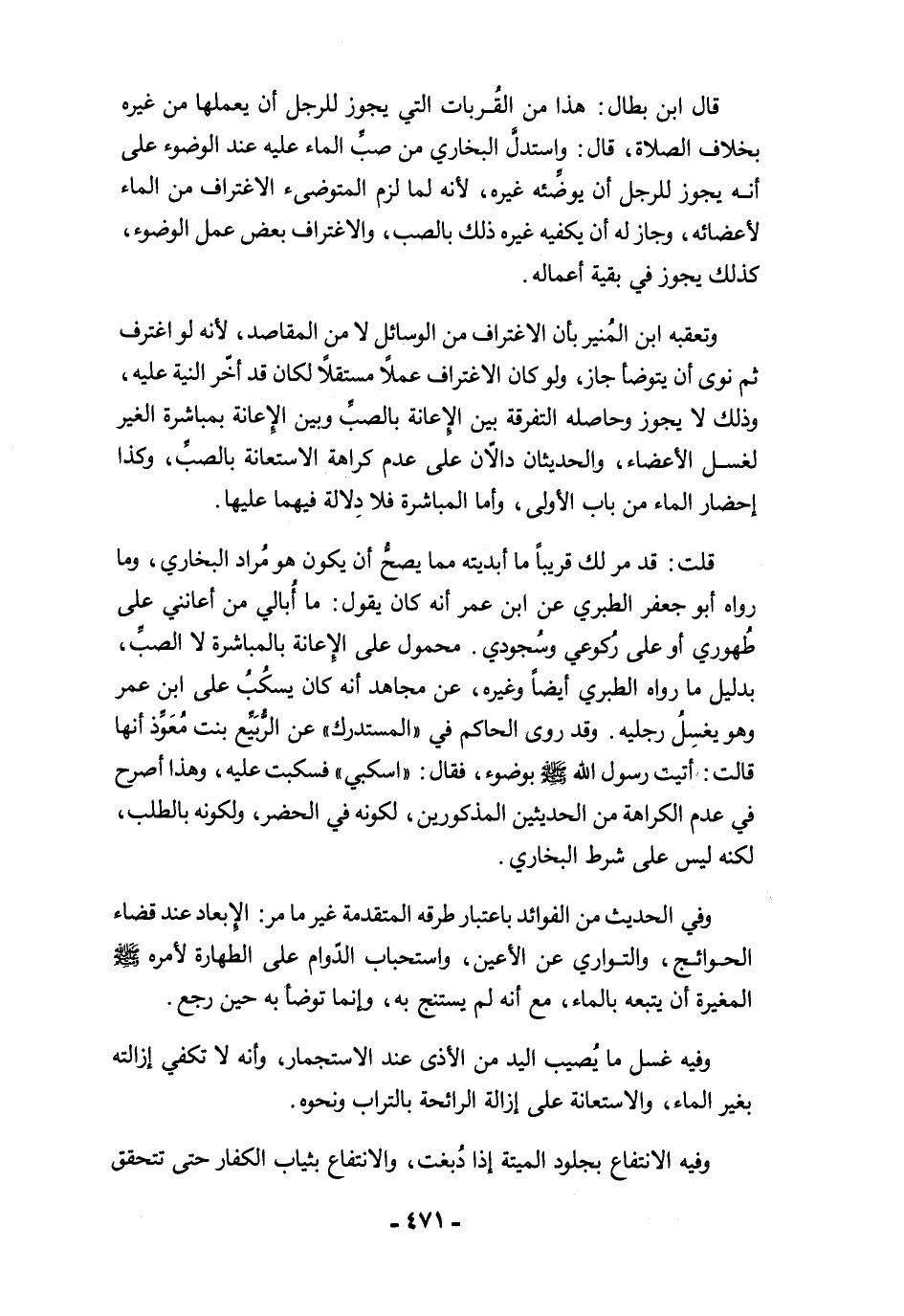 وتعقبه ابن المُنير بأن الاغتراف من الوسائل لا من المقاصد, لأنه لو اغترف ثم نوى أن يتوضأ جاز، ولو كان الاغتراف عملًا مستقلًا لكان قد أخّر النية عليه، وذلك لا يجوز وحاصله التفرقة بين الإعانة بالصبِّ وبين الإعانة بمباشرة الغير لغسل الأعضاء، والحديثان دالاّن على عدم كراهة الاستعانة بالصبِّ، وكذا إحضار الماء من باب الأولى، وأما المباشرة فلا دِلالة فيهما عليها.
