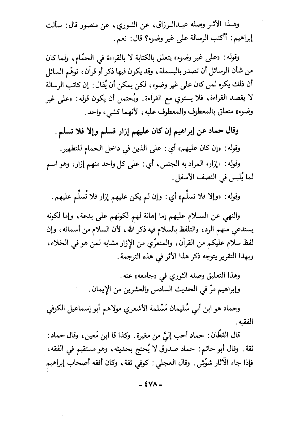 وهذا الأثر وصله عبد الرزاق، عن الثوري، عن منصور قال: سألت إبراهيم: أأكتب الرسالة على غير وضوء؟ قال: نعم.