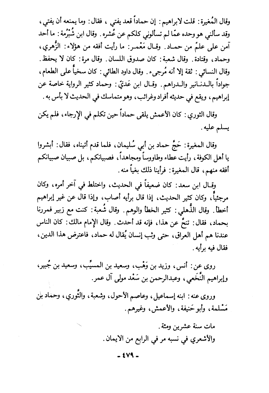 وقال ابن سعد: كان ضعيفًا في الحديث، واختلط في آخر أمره، وكان مرجئيًّا، وكان كثير الحديث، إذا قال برأيه أصاب، وإذا قال عن غير إبراهيم أخطأ. وقال الذُّهلي: كثير الخطأ والوهم. وقال شُعبة: كنت مع زبير فمررنا بحماد، فقال: تنحَّ عن هذا، فإنه قد أحدث. وقال الإِمام مالك: كان الناس عندنا هم أهل العراق، حتى وثب إنسان يُقال له حماد، فاعترض هذا الدين، فقال فيه برأيه.