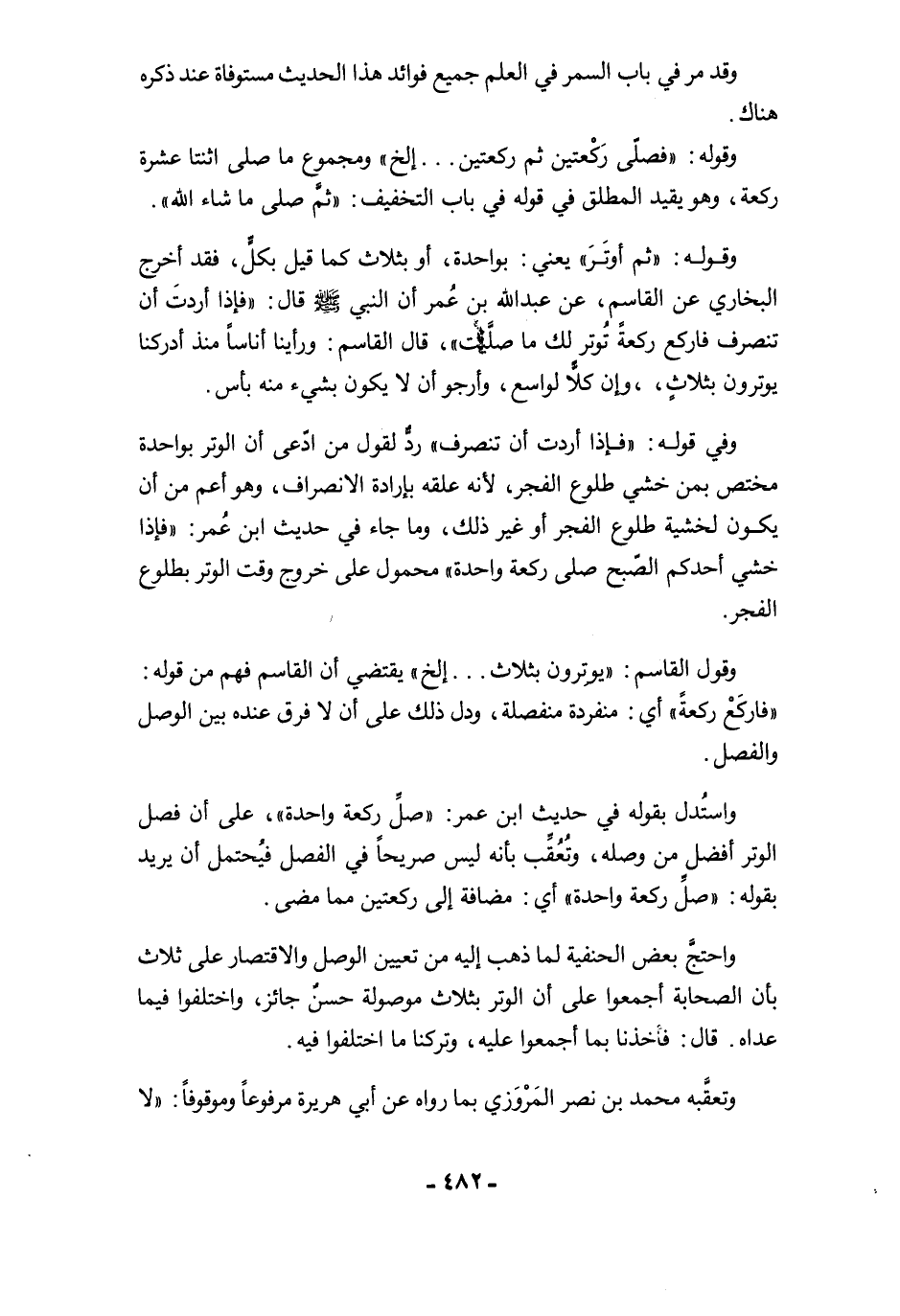 وفي قوله: "فإذا أردت أن تنصرف" ردٌّ لقول من ادّعى أن الوتر بواحدة مختص بمن خشي طلوع الفجر, لأنه علقه بإرادة الانصراف، وهو أعم من أن يكون لخشية طلوع الفجر أو غير ذلك، وما جاء في حديث ابن عُمر: "فإذا خشي أحدكم الصّبح صلى ركعة واحدة" محمول على خروج وقت الوتر بطلوع الفجر.