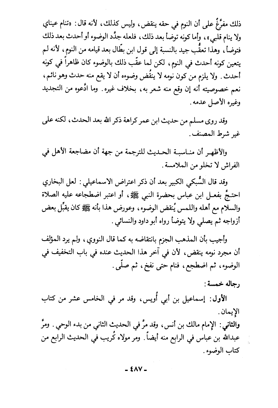 ذلك مفرَّغٌ على أن النوم في حقه ينقض، وليس كذلك؛ لأنه قال: "تنام عيناي ولا ينام قلبي"، وأما كونه توضأ بعد ذلك، فلعله جدَّد الوضوء أو أحدث بعد ذلك فتوضأ، وهذا تعقُّب جيد بالنسبة إلى قول ابن بطّال بعد قيامه من النوم؛ لأنه لم يتعين كونه أحدث في النوم، لكن لما عقَّب ذلك بالوضؤء كان ظاهرًا في كونه أحدث. ولا يلزم من كون نومه لا ينقُض وضوءه أن لا يقع منه حدث وهو نائم، نعم خصوصيته أنه إن وقع منه شعر به، بخلاف غيره. وما ادَّعوه من التجديد وغيره الأصل عدمه.
