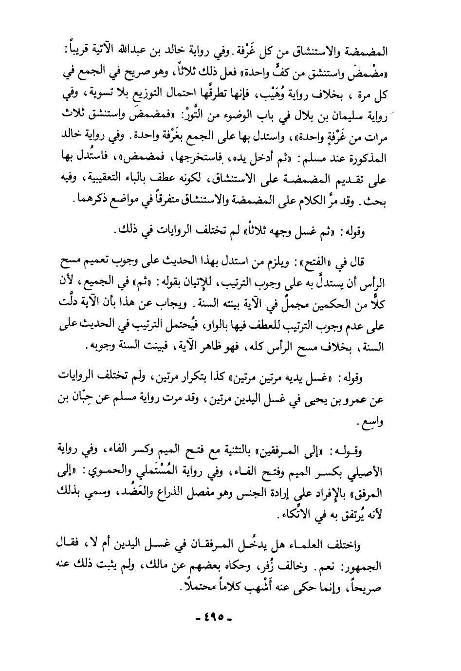 المضمضة والاستنشاق من كل غَرْفة. وفي رواية خالد بن عبد الله الآتية قريبًا: "مضْمضَ واستنشق من كفٍّ واحدة" فعل ذلك ثلاثًا، وهو صريح في الجمع في كل مرة، بخلاف رواية وُهَيْب، فإنها تطرقَّها احتمال التوزيع بلا تسوية، وفي رواية سليمان بن بلال في باب الوضوء من التَّورْ: "فمضمضَ واستنشق ثلاث مرات من غَرْفةٍ واحدة"، واستدل بها على الجمع بغَرْفة واحدة. وفي رواية خالد المذكورة عند مسلم: "ثم أدخل يده، فاستخرجها، فمضمض"، فاستُدل بها على تقديم المضمضة على الاستنشاق، لكونه عطف بالباء التعقيبية، وفيه بحث. وقد مرَّ الكلام على المضمضة والاستنشاق متفرقًا في مواضع ذكرهما.