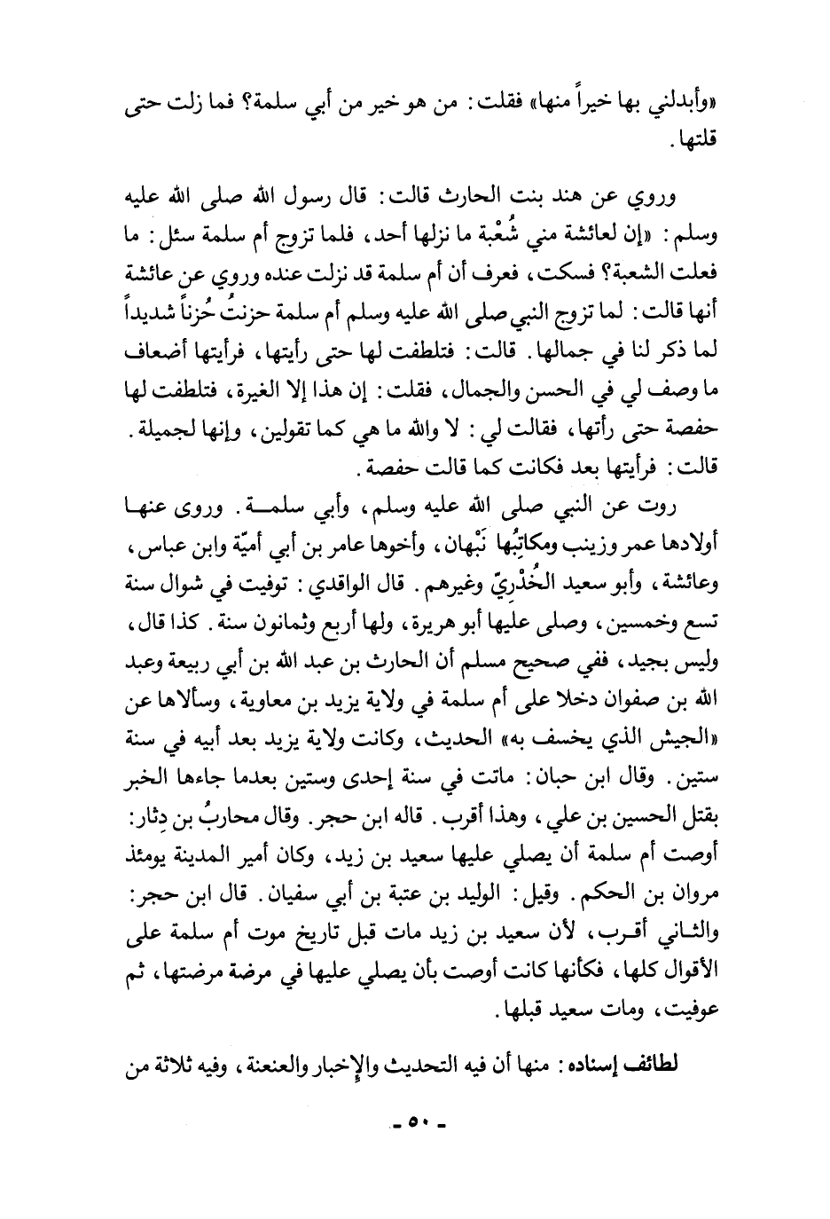 روت عن النبي صلى الله عليه وسلم، وأبي سلمة. وروى عنها أولادها عمر وزينب ومكاتِبُها نَبْهان، وأخوها عامر بن أبي أميّة وابن عباس، وعائشة، وأبو سعيد الخُدْرِيّ وغيرهم. قال الواقدي: توفيت في شوال سنة تسع وخمسين، وصلى عليها أبو هريرة، ولها أربع وثمانون سنة. كذا قال، وليس بجيد، ففي صحيح مسلم أن الحارث بن عبد الله بن أبي ربيعة وعبد الله بن صفوان دخلا على أم سلمة في ولاية يزيد بن معاوية، وسألاها عن "الجيش الذي يخسف به" الحديث، وكانت ولاية يزيد بعد أبيه في سنة ستين. وقال ابن حبان: ماتت في سنة إحدى وستين بعدما جاءها الخبر بقتل الحسين بن علي، وهذا أقرب. قاله ابن حجر. وقال محاربُ بن دِثار: أوصت أم سلمة أن يصلي عليها سعيد بن زيد، وكان أمير المدينة يومئذ مروان بن الحكم. وقيل: الوليد بن عتبة بن أبي سفيان. قال ابن حجر: والثاني أقرب؛ لأن سعيد بن زيد مات قبل تاريخ موت أم سلمة على الأقوال كلها، فكأنها كانت أوصت بأن يصلي عليها في مرضة مرضتها، ثم عوفيت، ومات سعيد قبلها.