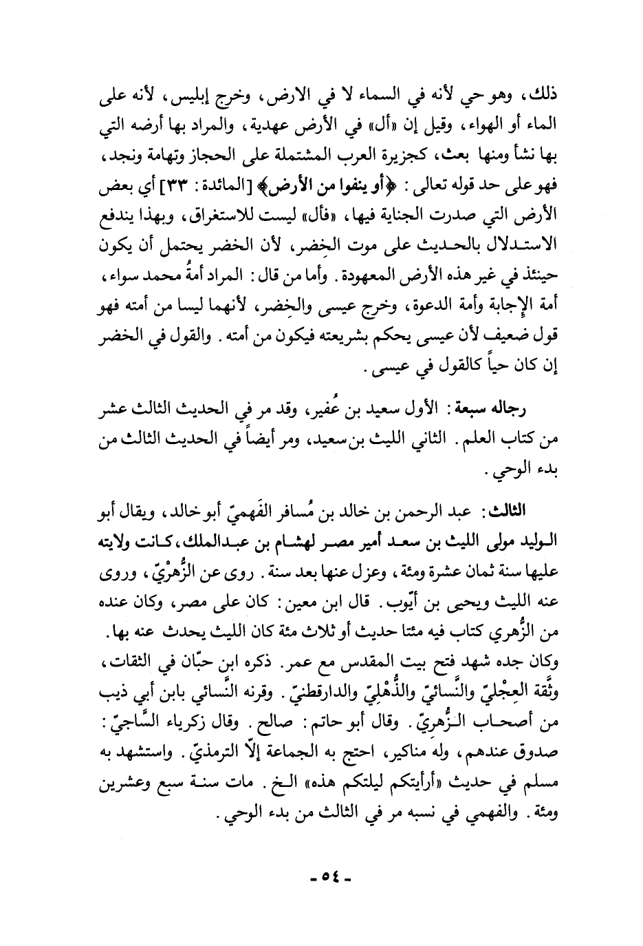 الثالث: عبد الرحمن بن خالد بن مُسافر الفَهميّ أبو خالد، ويقال أبو الوليد مولى الليث بن سعد أمير مصر لهشام بن عبد الملك، كانت ولايته عليها سنة ثمان عشرة ومئة، وعزل عنها بعد سنة. روى عن الزُّهرْيّ، وروى عنه الليث ويحيى بن أيّوب. قال ابن معين: كان على مصر، وكان عنده من الزُّهري كتاب فيه مئتا حديث أو ثلاث مئة كان الليث يحدث عنه بها. وكان جده شهد فتح بيت المقدس مع عمر. ذكره ابن حبّان في الثقات، وثَّقة العِجْليّ والنَّسائيّ والذُّهْلِيّ والدارقطنيّ. وقرنه النَّسائي بابن أبي ذيب من أصحاب الزُّهريّ. وقال أبو حاتم: صالح. وقال زكرياء السَّاجيّ: صدوق عندهم، ولهَ مناكير، احتج به الجماعة إلاَّ الترمذيّ. واستشهد به مسلم في حديث "أرأيتكم ليلتكم هذه" الخ. مات سنة سبع وعشرين ومئة. والفهمي في نسبه مر في الثالث من بدء الوحي.