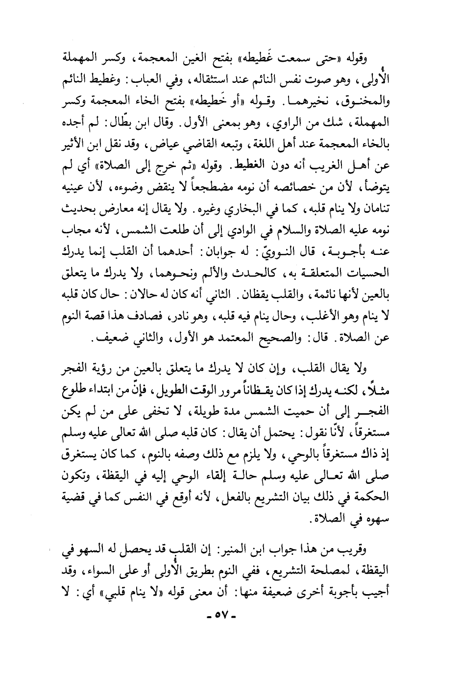 وقريب من هذا جواب ابن المنير: إن القلب قد يحصل له السهو في اليقظة، لمصلحة التشريع، ففي النوم بطريق الأولى أو على السواء، وقد أجيب بأجوبة أخرى ضعيفة منها: أن معنى قوله "لا ينام قلبي" أي: لا
