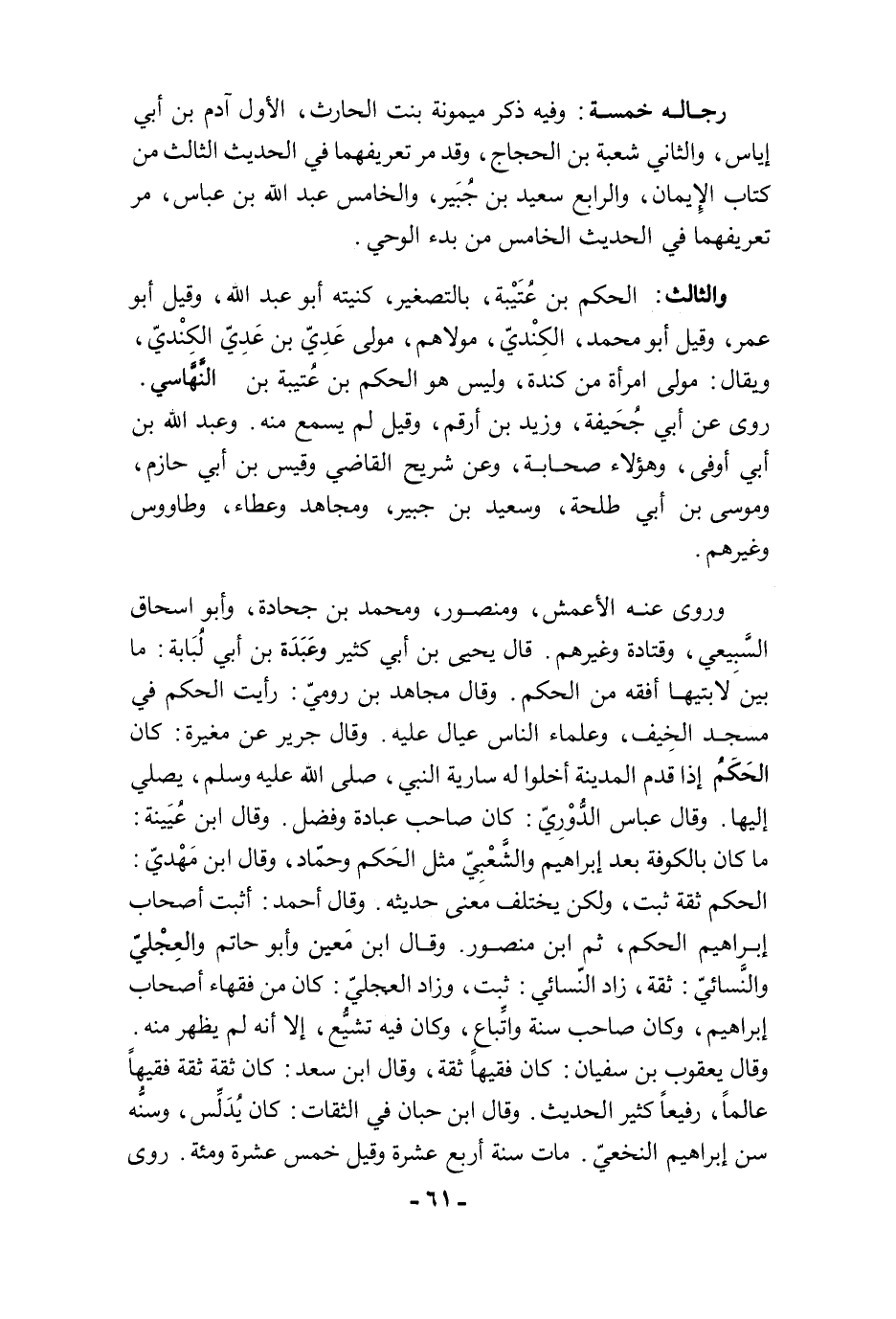 والثالث: الحكم بن عُتَيْبة، بالتصغير، كنيته أبو عبد الله، وقيل أبو عمر، وقيل أبو محمد، الكِنْديّ، مولاهم، مولى عَدِيّ بن عَدِيّ الكِنْديّ، ويقال: مولى امرأة من كندة، وليس هو الحكم بن عُتيبة بن النَّهَّاسي. روى عن أبي جُحَيفة، وزيد بن أرقم، وقيل لم يسمع منه. وعبد الله بن أبي أوفى، وهؤلاء صحابة، وعن شريح القاضي وقيس بن أبي حازم، وموسى بن أبي طلحة، وسعيد بن جبير، ومجاهد وعطاء، وطاووس وغيرهم.