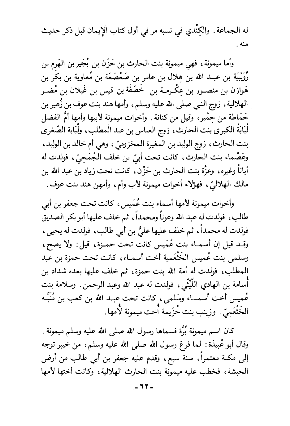 وأما ميمونة، فهي ميمونة بنت الحارث بن حَزْن بن بُجَير بن الهَرِم بن رُوَيْبيَة بن عبد الله بن هِلال بن عامر بن صَعْصَعَة بن مُعاوية بن بكر بن هَوازن بن منصور بن عِكْرمة بن خَصَفَة بن قيس بن غَيلان بن مُضر الهلالية، زوج النبي صلى الله عليه وسلم، وأمها هند بنت عوف بن زُهير بن حَمَاطة من حِمْير، وقيل من كنانة. وأخوات ميمونة لأبيها وأمها أُمُّ الفضل لُبَابَةُ الكبرى بنت الحارث، زوج العباس بن عبد المطلب، ولُبَابة الصّغرى بنت الحارث، زوج الوليد بن المغيرة المخزوميّ، وهي أم خالد بن الوليد، وعَصْماء بنت الحارث، كانت تحت أبيّ بن خلف الجُمَحِيّ، فولدت له أبانًا وغيره، وعزَّة بنت الحارث بن حَزْن، كانت تحت زياد بن عبد الله بن مالك الهلاليّ، فهؤلاء أخوات ميمونة لأب وأم، وأمهن هند بنت عوف.
