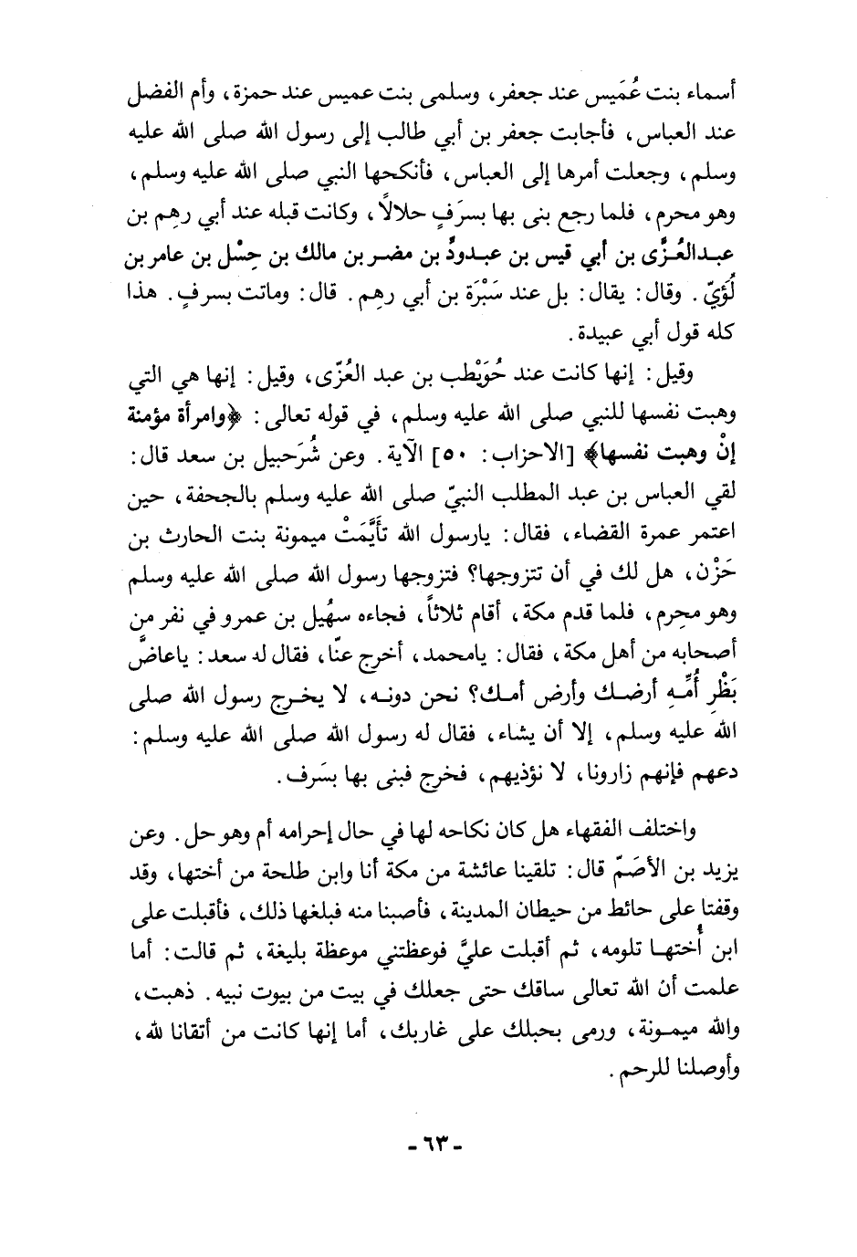 أسماء بنت عُمَيس عند جعفر، وسلمى بنت عميس عند حمزة، وأم الفضل عند العباس، فأجابت جعفر بن أبي طالب إلى رسول الله صلى الله عليه وسلم، وجعلت أمرها إلى العباس، فأنكحها النبي صلى الله عليه وسلم، وهو محرم، فلما رجع بني بها بسرَفٍ حلالًا، وكانت قبله عند أبي رهِم بن عبد العُزَّى بن أبي قيس بن عبدودّ بن مضربن مالك بن حِسْل بن عامر بن لُؤَيّ. وقال: يقال: بل عند سَبْرَة بن أبي رهِم. قال: وماتت بسرفٍ. هذا كله قول أبي عبيدة.