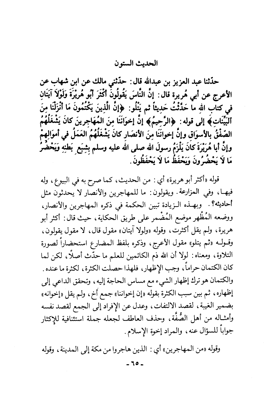 حَدَّثَنَا عَبْدُ الْعَزِيزِ بْنُ عَبْدِ اللَّهِ قَالَ: حَدَّثَنِي مَالِكٌ عَنِ ابْنِ شِهَابٍ عَنِ الأَعْرَجِ عَنْ أَبِى هُرَيْرَةَ قَالَ: إِنَّ النَّاسَ يَقُولُونَ أَكْثَرَ أَبُو هُرَيْرَةَ، وَلَوْلاَ آيَتَانِ فِى كِتَابِ اللَّهِ مَا حَدَّثْتُ حَدِيثًا، ثُمَّ يَتْلُو {إِنَّ الَّذِينَ يَكْتُمُونَ مَا أَنْزَلْنَا مِنَ الْبَيِّنَاتِ} إِلَى قَوْلِهِ {الرَّحِيمُ} إِنَّ إِخْوَانَنَا مِنَ الْمُهَاجِرِينَ كَانَ يَشْغَلُهُمُ الصَّفْقُ بِالأَسْوَاقِ، وِإِنَّ إِخْوَانَنَا مِنَ الأَنْصَارِ كَانَ يَشْغَلُهُمُ الْعَمَلُ فِى أَمْوَالِهِمْ، وَإِنَّ أَبَا هُرَيْرَةَ كَانَ يَلْزَمُ رَسُولَ اللَّهِ -صلى الله عليه وسلم- بِشِبَعِ بَطْنِهِ وَيَحْضُرُ مَا لاَ يَحْضُرُونَ، وَيَحْفَظُ مَا لاَ يَحْفَظُونَ.