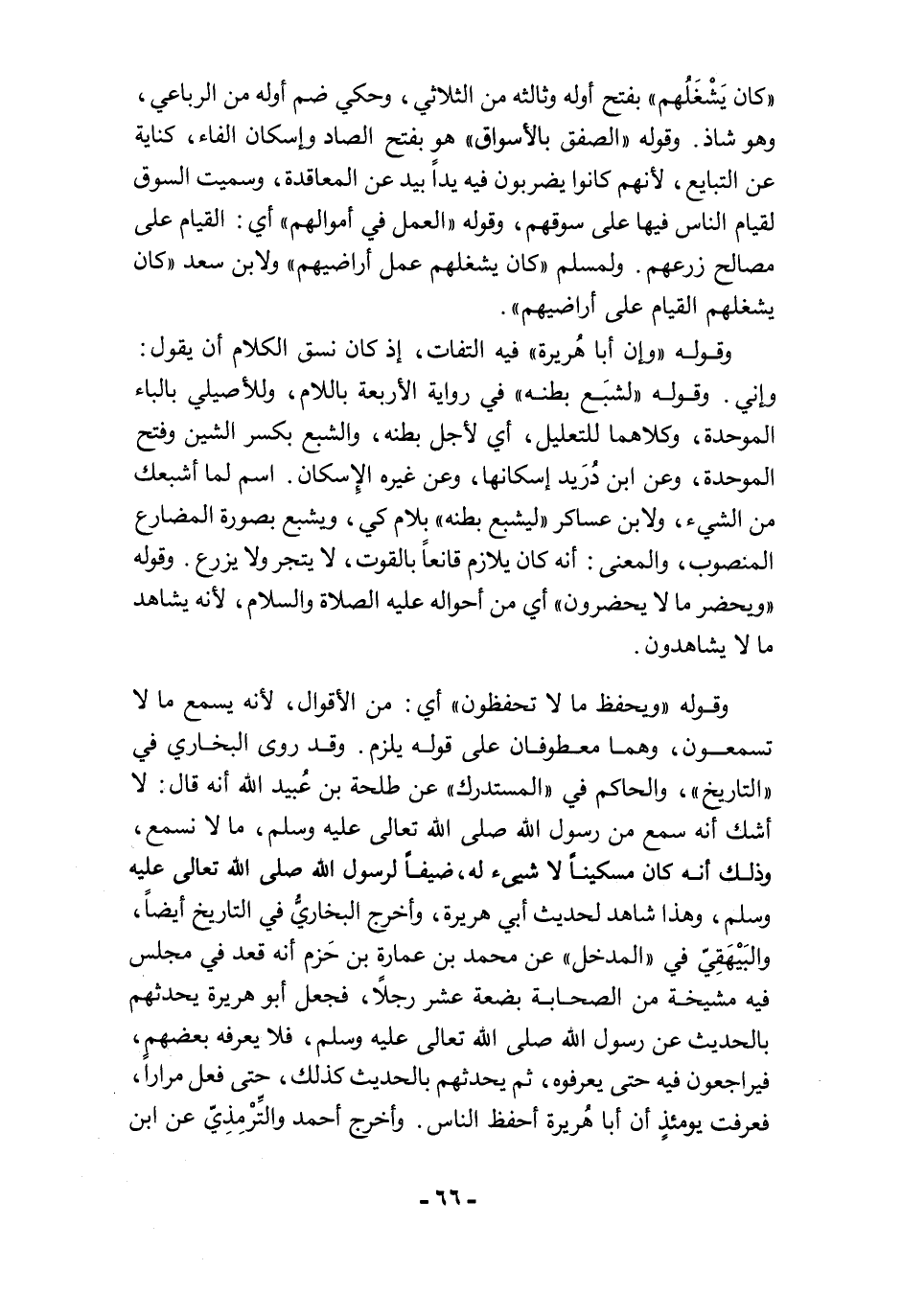 وقوله "وإن أبا هُريرة" فيه التفات، إذ كان نسق الكلام أن يقول: وإني. وقوله "لشبَع بطنه" في رواية الأربعة باللام، وللأصيلي بالباء الموحدة، وكلاهما للتعليل، أي لأجل بطنه، والشبع بكسر الشين وفتح الموحدة، وعن ابن دُرَيد إسكانها، وعن غيره الِإسكان. اسم لما أشبعك من الشيء، ولابن عساكر "ليشبع بطنه" بلام كي، ويشبع بصورة المضارع المنصوب، والمعنى: أنه كان يلازم قانعًا بالقوت، لا يتجر ولا يزرع. وقوله "ويحضر ما لا يحضرون" أي من أحواله عليه الصلاة والسلام؛ لأنه يشاهد ما لا يشاهدون.