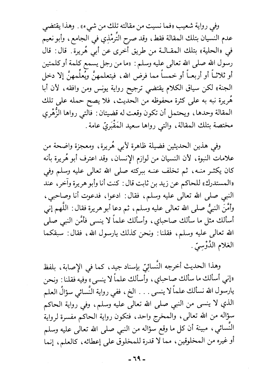 وفي رواية شعيب "فما نسيت من مقالته تلك من شيء". وهذا يقتضي عدم النسيان بتلك المقالة فقط، وقد صرح التِّرمْذِي في الجامع، وأبو نعيم في "الحلية" بتلك المقالة من طريق أخرى عن أبي هريرة. قال: قال رسول الله صلى الله تعالى عليه وسلم: "ما من رجل يسمع كلمة أو كلمتين أو ثلاثًا أو أربعًا أو خمسًا مما فرض الله، فيتعلمهنَّ ويُعلِّمهنَّ إلا دخل الجنة" لكن سياق الكلام يقتضي ترجيح رواية يونس ومن وافقه؛ لأن أبا هُريرة نبه به على كثرة محفوظه من الحديث، فلا يصح حمله على تلك المقالة وحدها، ويحتمل أن تكون وقعت له قضيتان: فالتي رواها الزُّهْري مختصة بتلك المقالة، والتي رواها سعيد المَقْبَريّ عامة.