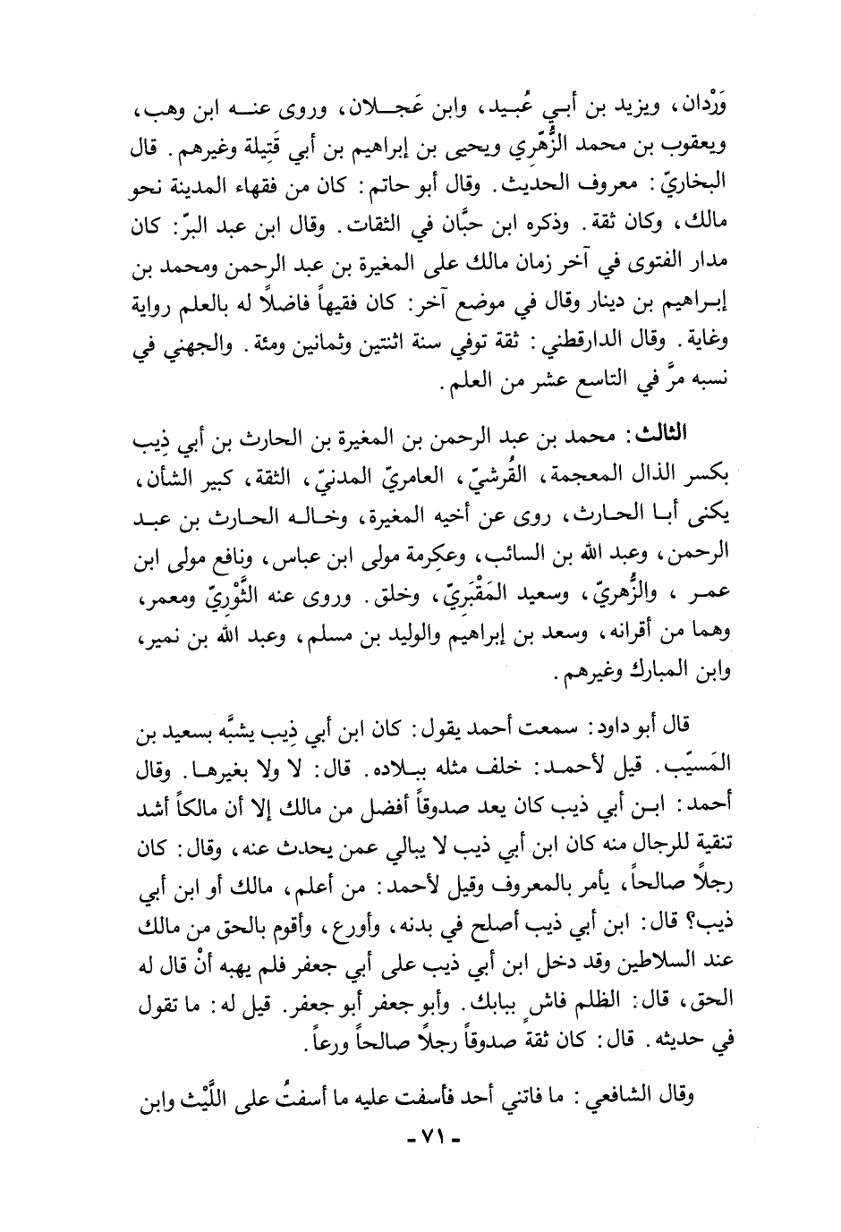 الثالث: محمد بن عبد الرحمن بن المغيرة بن الحارث بن أبي ذِيب بكسر الذال المعجمة، القُرشيّ، العامريّ المدنيّ، الثقة، كبير الشأن، يكنى أبا الحارث، روى عن أخيه المغيرة، وخاله الحارث بن عبد الرحمن، وعبد الله بن السائب، وعكرمة مولى ابن عباس، ونافع مولى ابن عمر، والزُّهريّ، وسعيد المَقْبَرِيّ، وخلق. وروى عنه الثّوْرِيّ ومعمر، وهما من أقرانه، وسعد بن إبراهيم والوليد بن مسلم، وعبد الله بن نمير، وابن المبارك وغيرهم.