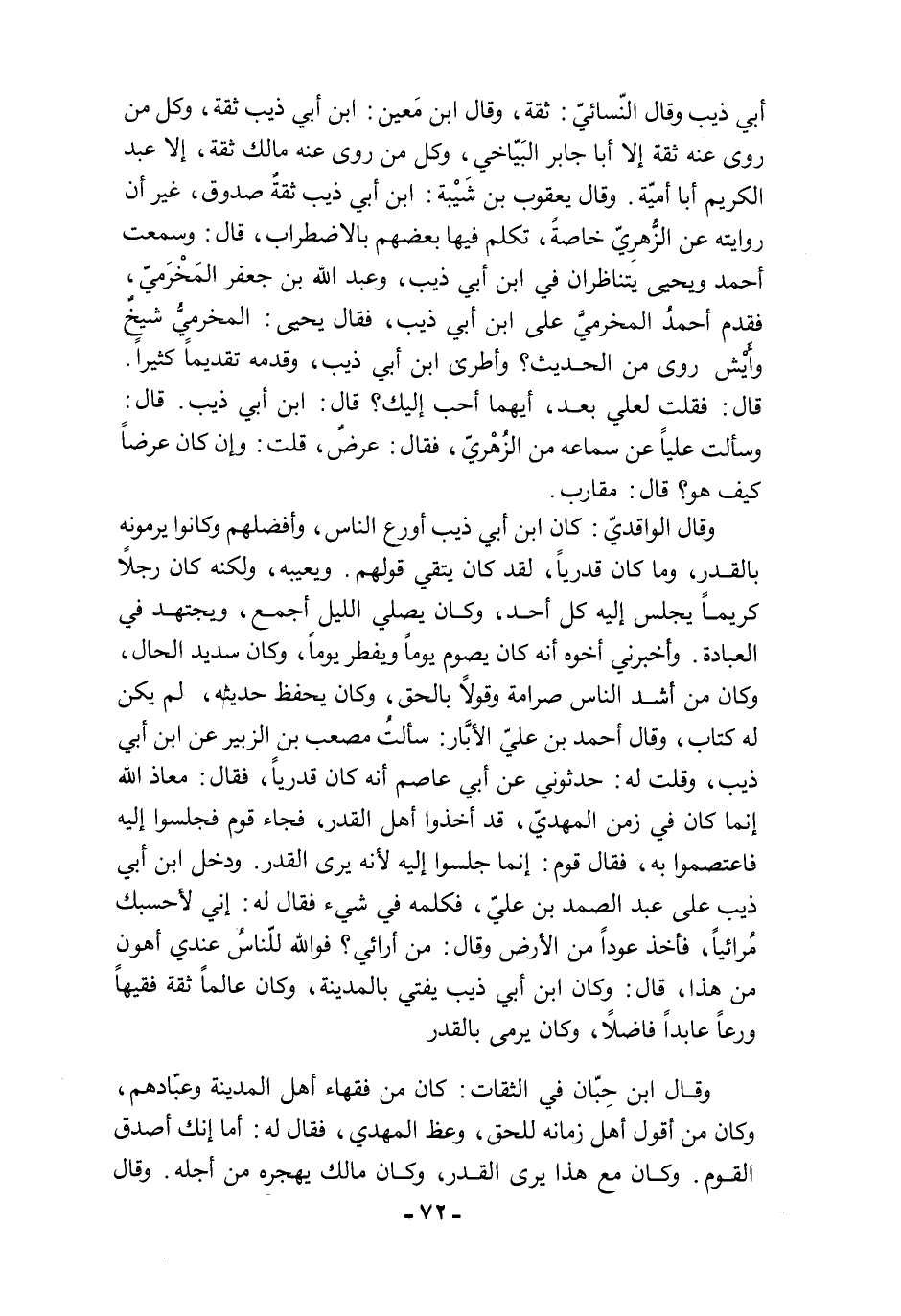 وقال الواقديّ: كان ابن أبي ذيب أورع الناس، وأفضلهم وكانوا يرمونه بالقدر، وما كان قدريًا، لقد كان يتقي قولهم. ويعيبه، ولكنه كان رجلًا كريمًا يجلس إليه كل أحد، وكان يصلي الليل أجمع، ويجتهد في العبادة. وأخبرني أخوه أنه كان يصوم يومًا ويفطر يومًا، وكان شديد الحال، وكان من أشد الناس صرامة وقولًا بالحق، وكان يحفظ حديثه، لم يكن له كتاب، وقال أحمد بن عليّ الأبَّار: سألتُ مصعب بن الزبير عن ابن أبي ذيب، وقلت له: حدثوني عن أبي عاصم أنه كان قدريًا، فقال: معاذ الله إنما كان في زمن المهديّ، قد أخذوا أهل القدر، فجاء قوم فجلسوا إليه فاعتصموا به، فقال قوم: إنما جلسوا إليه لأنه يرى القدر. ودخل ابن أبي ذيب على عبد الصمد بن عليّ، فكلمه في شيء فقال له: إني لأحسبك مُرائيًا، فأخذ عودًا من الأرض وقال: من أرائي؟ فوالله للناسُ عندي أهون من هذا، قال: وكان ابن أبي ذيب يفتي بالمدينة، وكان عالمًا ثقة فقيهًا ورعًا عابدًا فاضلًا، وكان يرمى بالقدر