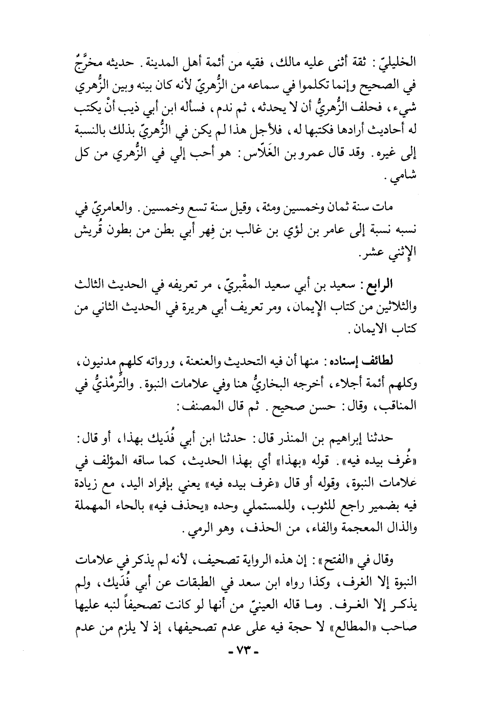 لطائف إسناده: منها أن فيه التحديث والعنعنة، ورواته كلهم مدنيون، وكلهم أئمة أجلاء، أخرجه البخاري هنا وفي علامات النبوة. والتِّرمْذيُّ في المناقب، وقال: حسن صحيح. ثم قال المصنف: