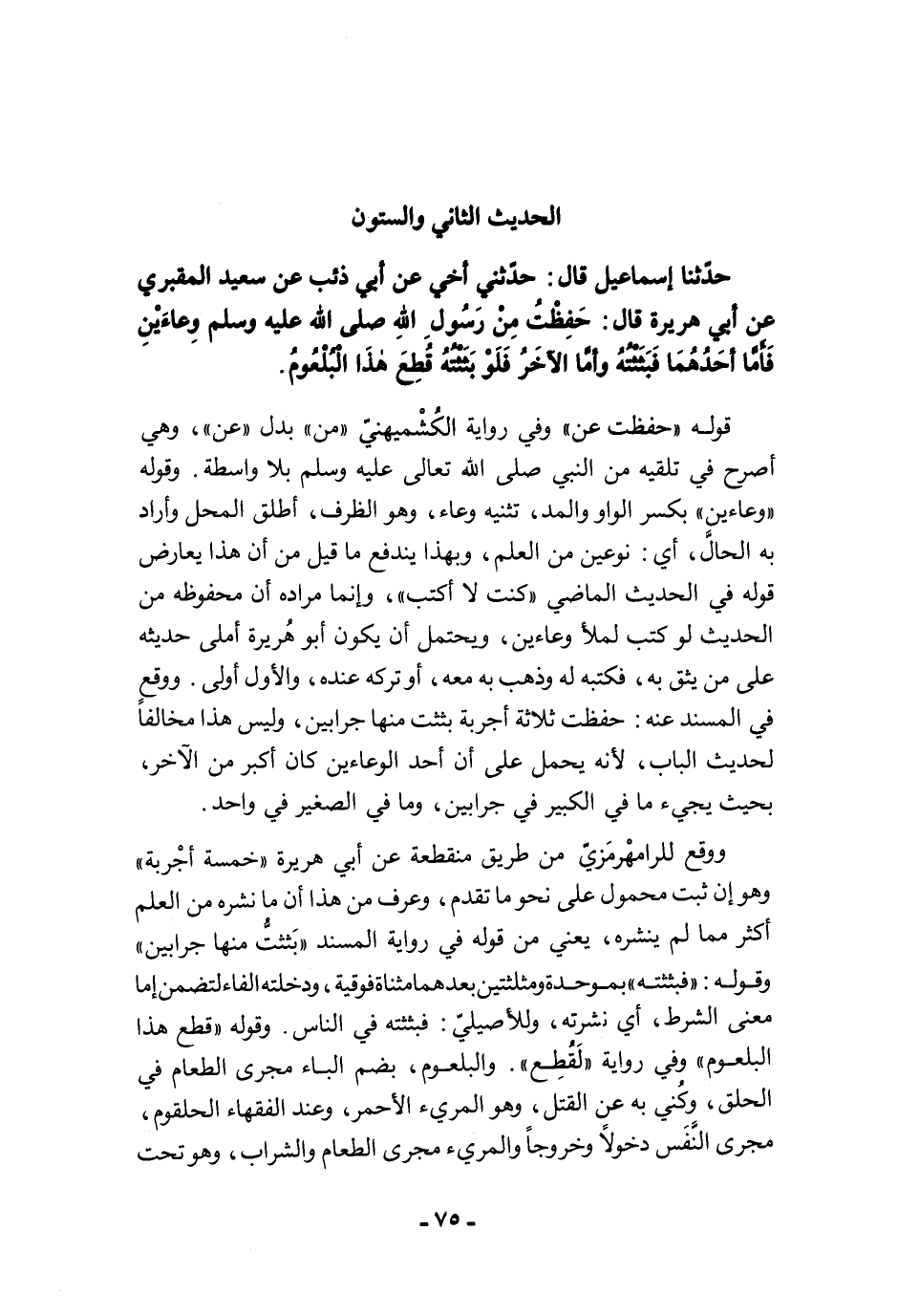 حَدَّثَنَا إِسْمَاعِيلُ قَالَ: حَدَّثَنِي أَخِي عَنِ ابْنِ أَبِى ذِئْبٍ عَنْ سَعِيدٍ الْمَقْبُرِيِّ عَنْ أَبِي هُرَيْرَةَ قَالَ: حَفِظْتُ مِنْ رَسُولِ اللَّهِ -صلى الله عليه وسلم- وِعَاءَيْنِ، فَأَمَّا أَحَدُهُمَا فَبَثَثْتُهُ، وَأَمَّا الآخَرُ فَلَوْ بَثَثْتُهُ قُطِعَ هَذَا الْبُلْعُومُ.