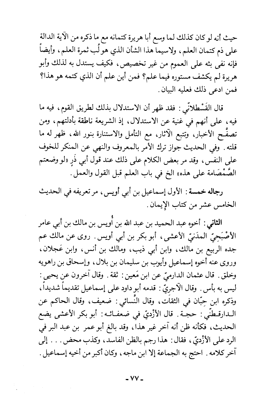 حيث أنه لو كان كذلك لما وسع أبا هريرة كتمانه مع ما ذكره من الآية الدالة على ذم كتمان العلم، ولاسيما هذا الشأن الذي هو لُب ثمرة العلم، وأيضًا فإنه نفى بثه على العموم من غير تخصيص، فكيف يستدل به لذلك وأبو هريرة لم يكشف مستوره فيما علم؟ فمن أين علم أن الذي كتمه هو هذا؟ فمن ادعى ذلك فعليه البيان.