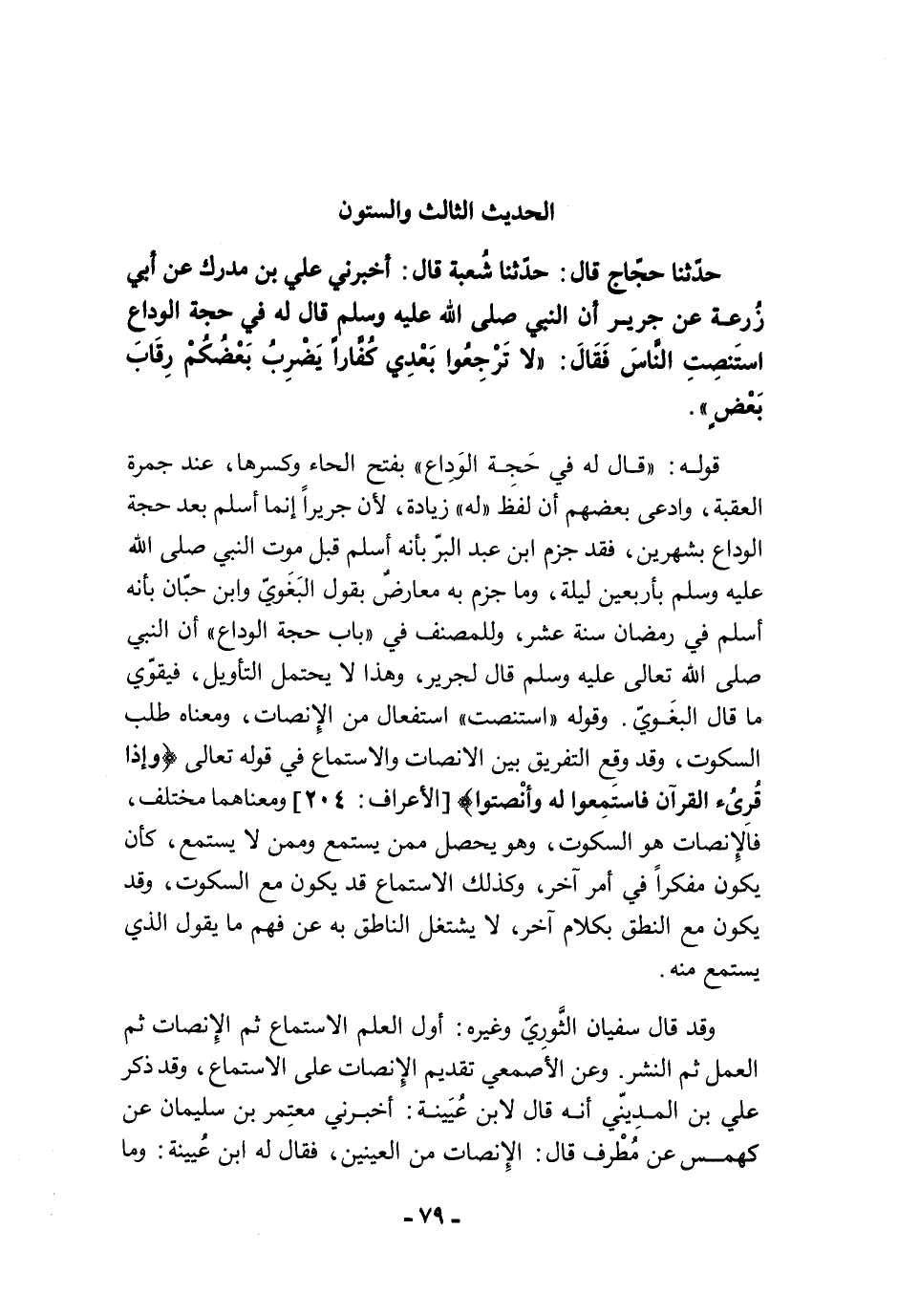 حَدَّثَنَا حَجَّاجٌ قَالَ: حَدَّثَنَا شُعْبَةُ قَالَ: أَخْبَرَنِي عَلِىُّ بْنُ مُدْرِكٍ عَنْ أَبِي زُرْعَةَ عَنْ جَرِيرٍ أَنَّ النَّبِيَّ -صلى الله عليه وسلم- قَالَ لَهُ فِى حَجَّةِ الْوَدَاعِ "اسْتَنْصِتِ النَّاسَ" فَقَالَ: "لاَ تَرْجِعُوا بَعْدِي كُفَّارًا يَضْرِبُ بَعْضُكُمْ رِقَابَ بَعْضٍ".
