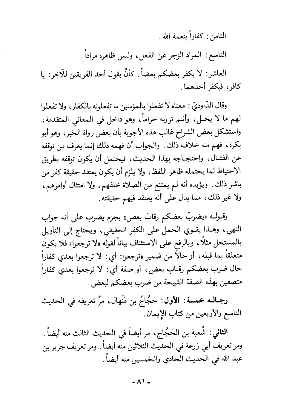 وقوله "يضربْ بعضكم رقابَ بعض" بجزم يضرب على أنه جواب النهي، وهذا يقوي الحمل على الكفر الحقيقي، ويحتاج إلى التأويل بالمستحل مثلًا، وبالرفع على الاستئناف بيانًا لقوله "لا ترجعوا" فلا يكون متعلقًا بما قبله، أوحالًا من ضمير "ترجعوا" أي: لا ترجعوا بعدي كفارًا حال ضرب بعضكم رقاب بعض، أو صفة أي: لا ترجعوا بعدي كفارًا متصفين بهذه الصفة القبيحة من ضرب بعضكم لبعض.