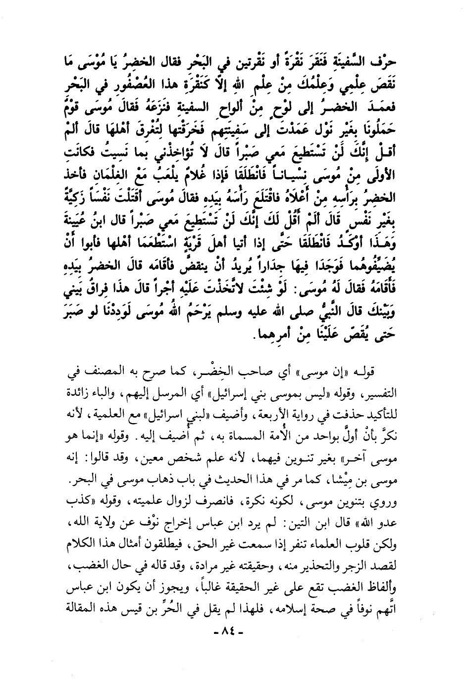 حَرْفِ السَّفِينَةِ، فَنَقَرَ نَقْرَةً أَوْ نَقْرَتَيْنِ فِى الْبَحْرِ. فَقَالَ الْخَضِرُ يَا مُوسَى، مَا نَقَصَ عِلْمِى وَعِلْمُكَ مِنْ عِلْمِ اللَّهِ إِلاَّ كَنَقْرَةِ هَذَا الْعُصْفُورِ فِى الْبَحْرِ. فَعَمَدَ الْخَضِرُ إِلَى لَوْحٍ مِنْ أَلْوَاحِ السَّفِينَةِ فَنَزَعَهُ. فَقَالَ مُوسَى قَوْمٌ حَمَلُونَا بِغَيْرِ نَوْلٍ، عَمَدْتَ إِلَى سَفِينَتِهِمْ فَخَرَقْتَهَا لِتُغْرِقَ أَهْلَهَا قَالَ أَلَمْ أَقُلْ إِنَّكَ لَنْ تَسْتَطِيعَ مَعِيَ صَبْرًا قَالَ لاَ تُؤَاخِذْنِي بِمَا نَسِيتُ. فَكَانَتِ الأُولَى مِنْ مُوسَى نِسْيَانًا. فَانْطَلَقَا فَإِذَا غُلاَمٌ يَلْعَبُ مَعَ الْغِلْمَانِ، فَأَخَذَ الْخَضِرُ بِرَأْسِهِ مِنْ أَعْلاَهُ فَاقْتَلَعَ رَأْسَهُ بِيَدِهِ. فَقَالَ مُوسَى أَقَتَلْتَ نَفْسًا زَكِيَّةً بِغَيْرِ نَفْسٍ قَالَ أَلَمْ أَقُلْ لَكَ إِنَّكَ لَنْ تَسْتَطِيعَ مَعِىَ صَبْرًا قَالَ ابْنُ عُيَيْنَةَ وَهَذَا أَوْكَدُ فَانْطَلَقَا حَتَّى إِذَا أَتَيَا أَهْلَ قَرْيَةٍ اسْتَطْعَمَا أَهْلَهَا، فَأَبَوْا أَنْ يُضَيِّفُوهُمَا، فَوَجَدَا فِيهَا جِدَارًا يُرِيدُ أَنْ يَنْقَضَّ فَأَقَامَهُ. قَالَ الْخَضِرُ بِيَدِهِ فَأَقَامَهُ. فَقَالَ لَهُ مُوسَى: لَوْ شِئْتَ لاَتَّخَذْتَ عَلَيْهِ أَجْرًا. قَالَ هَذَا فِرَاقُ بَيْنِي وَبَيْنِكَ". قَالَ النَّبِيُّ -صلى الله عليه وسلم- "يَرْحَمُ اللَّهُ مُوسَى، لَوَدِدْنَا لَوْ صَبَرَ حَتَّى يُقَصَّ عَلَيْنَا مِنْ أَمْرِهِمَا".