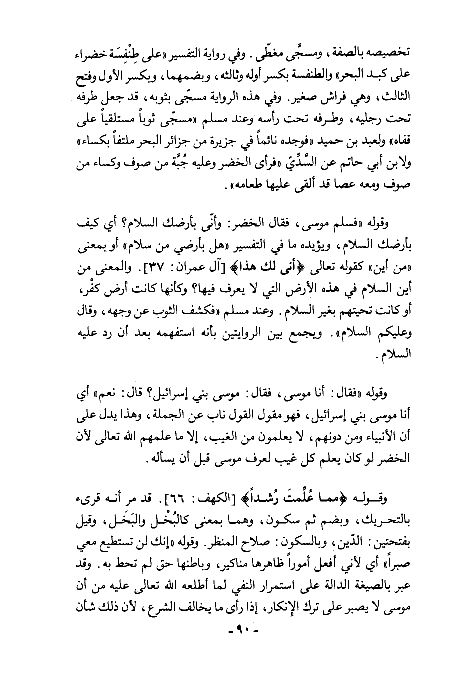 تخصيصه بالصفة، ومسجَّى مغطّى. وفي رواية التفسير"على طِنْفِسَة خضراء على كبد البحر" والطنفسة بكسر أوله وثالثه، وبضمهما، وبكسر الأول وفتح الثالث، وهي فراش صغير. وفي هذه الرواية مسجّى بثوبه، قد جعل طرفه تحت رجليه، وطرفه تحت رأسه وعند مسلم "مسجّى ثوبًا مستلقيًا على قفاه" ولعبد بن حميد "فوجده نائمًا في جزيرة من جزائر البحر ملتفًا بكساء" ولابن أبي حاتم عن السَّدِّيّ "فرأى الخضر وعليه جُبَّة من صوف وكساء من صوف ومعه عصا قد ألقى عليها طعامه".