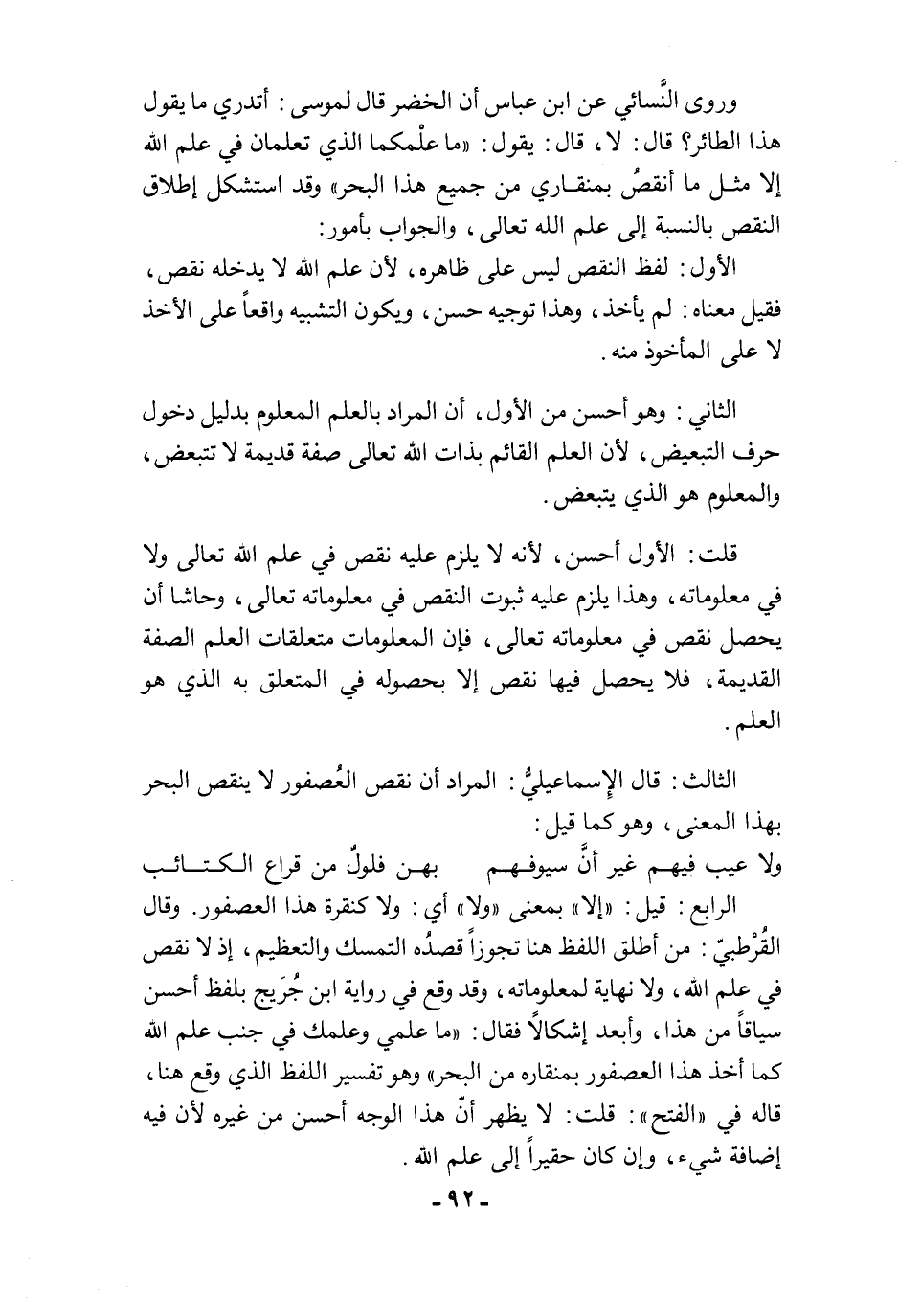 وروى النَّسائي عن ابن عباس أن الخضر قال لموسى: أتدري ما يقول هذا الطائر؟ قال: لا، قال يقول: "ما علْمكما الذي تعلمان في علم الله إلا مثل ما أنقصُ بمنقاري من جميع هذا البحر" وقد استشكل إطلاق النقص بالنسبة إلى علم الله تعالى، والجواب بأمور: