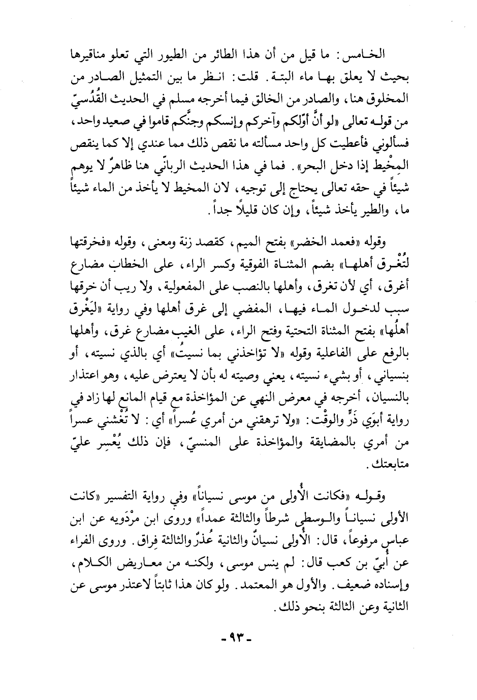 وقوله "فكانت الأُولى من موسى نسيانًا" وفي رواية التفسير "كانت الأولى نسيانًا والوسطى شرطًا والثالثة عمدًا" وروى ابن مرْدَويه عن ابن عباس مرفوعًا، قال: الأولى نسيانٌ والثانية عُذرٌ والثالثة فِراق. وروى الفراء عن أُبيّ بن كعب قال: لم ينس موسى، ولكنه من معاريض الكلام، وإسناده ضعيف. والأول هو المعتمد. ولو كان هذا ثابتًا لاعتذر موسى عن الضمانية وعن الثالثة بنحو ذلك.