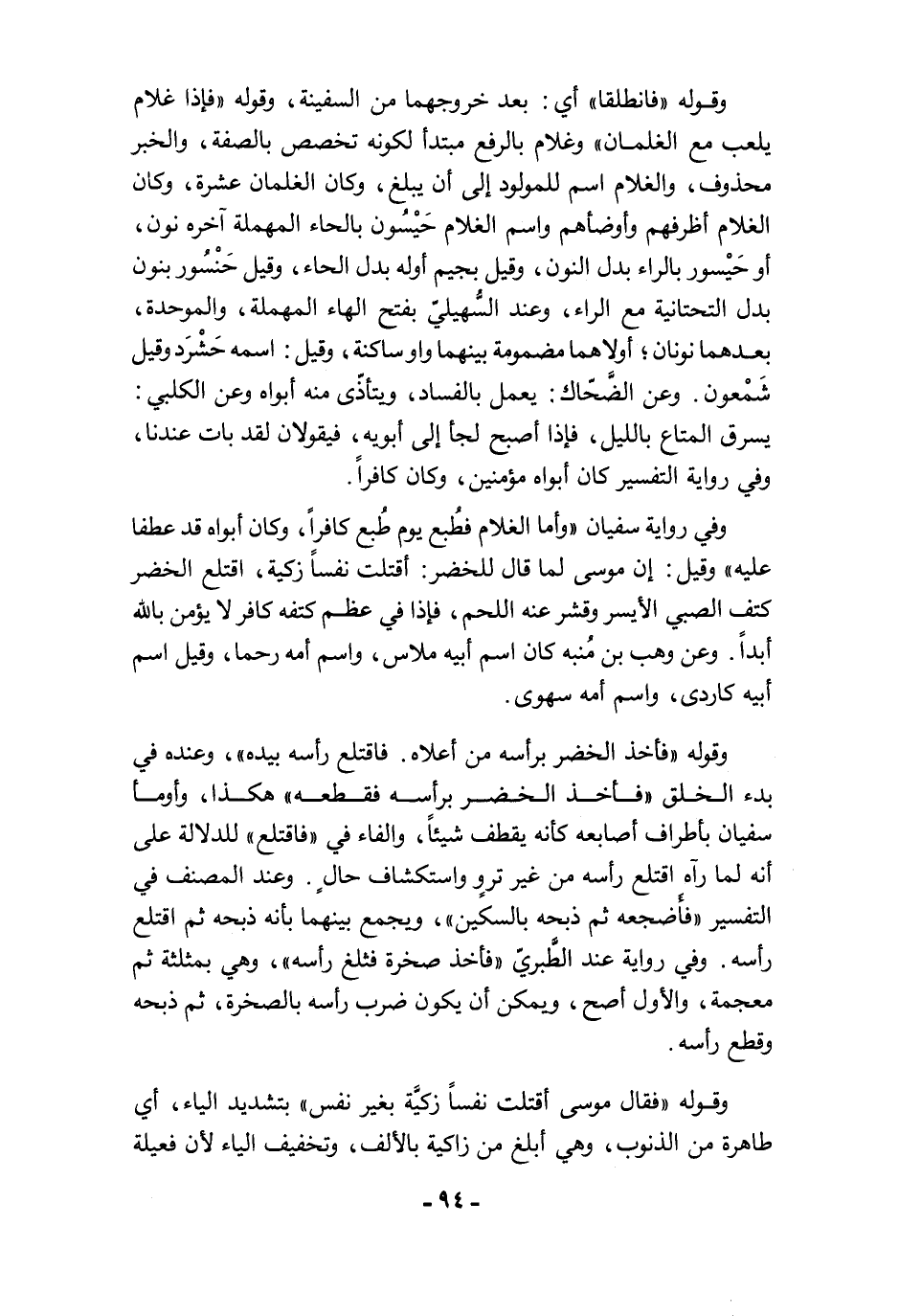 وفي رواية سفيان "وأما الغلام فطُبع يوم طُبع كافرًا، وكان أبواه قد عطفا عليه" وقيل: إن موسى لما قال للخضر: أقتلت نفسًا زكية، اقتلع الخضر كتف الصبي الأيسر وقشر عنه اللحم، فإذا في عظم كتفه كافر لا يؤمن بالله أبدًا. وعن وهب بن مُنبه كان اسم أبيه ملاس، واسم أمه رحما، وقيل اسم أبيه كاردى، واسم أمه سهوى.