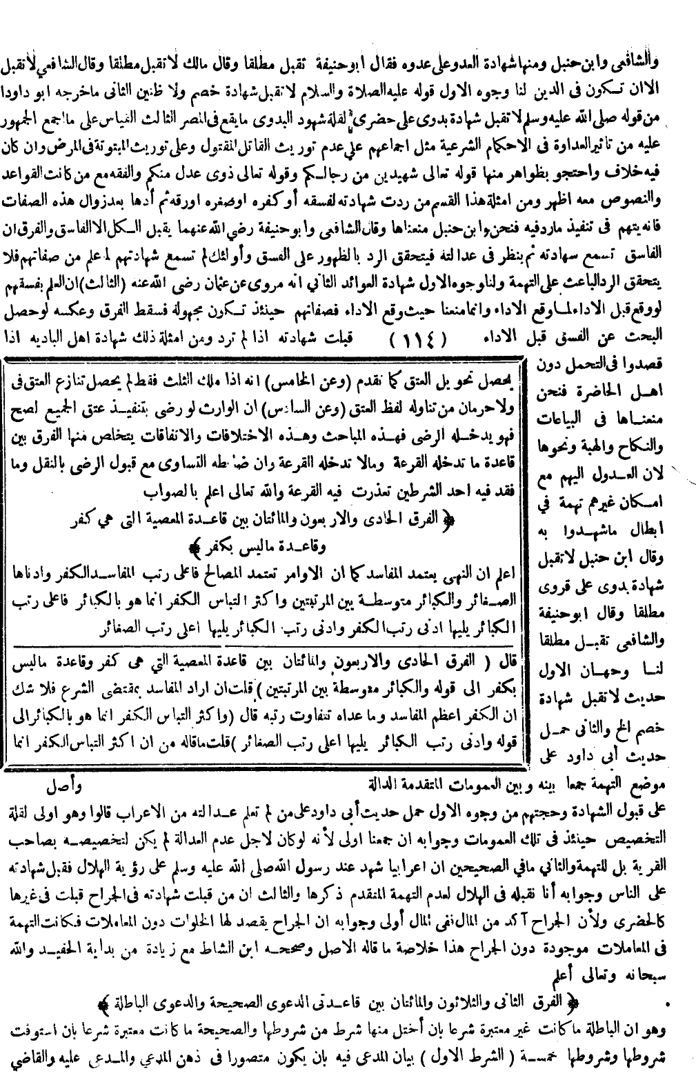 وَقَالَ ابْنُ حَنْبَلٍ لَا تُقْبَلُ شَهَادَةُ بَدَوِيٍّ عَلَى قَرَوِيٍّ مُطْلَقًا، وَقَالَ أَبُو حَنِيفَةَ وَالشَّافِعِيُّ تُقْبَلُ مُطْلَقًا لَنَا، وَجْهَانِ الْأَوَّلُ حَدِيثُ لَا تُقْبَلُ شَهَادَةُ خَصْمٍ إلَخْ، وَالثَّانِي حَمْلُ حَدِيثِ أَبِي دَاوُد عَلَى مَوْضِعِ التُّهْمَةِ جَمْعًا بَيْنَهُ وَبَيْنَ الْعُمُومَاتِ الْمُتَقَدِّمَةِ الدَّالَّةِ عَلَى قَبُولِ الشَّهَادَةِ، وَحُجَّتُهُمْ مِنْ وُجُوهٍ الْأَوَّلُ حَمْلُ حَدِيثِ أَبِي دَاوُد عَلَى مَنْ لَمْ تُعْلَمْ عَدَالَتُهُ مِنْ الْأَعْرَابِ قَالُوا: وَهُوَ أَوْلَى لِقِلَّةِ التَّخْصِيصِ حِينَئِذٍ فِي تِلْكَ الْعُمُومَاتِ، وَجَوَابُهُ أَنَّ جَمْعَنَا أَوْلَى لِأَنَّهُ لَوْ كَانَ لِأَجْلِ عَدَمِ الْعَدَالَةِ لَمْ يَكُنْ لِتَخْصِيصِهِ بِصَاحِبِ الْقَرْيَةِ بَلْ لِلتُّهْمَةِ، وَالثَّانِي مَا فِي الصَّحِيحَيْنِ «أَنَّ أَعْرَابِيًّا شَهِدَ عِنْدَ رَسُولِ اللَّهِ - صَلَّى اللَّهُ عَلَيْهِ وَسَلَّمَ - عَلَى رُؤْيَةِ الْهِلَالِ فَقَبِلَ شَهَادَتَهُ عَلَى النَّاسِ» ، وَجَوَابُهُ أَنَّا نَقْبَلُهُ فِي الْهِلَالِ لِعَدَمِ التُّهْمَةِ الْمُتَقَدِّمِ ذِكْرُهَا، وَالثَّالِثُ أَنَّ مَنْ قُبِلَتْ شَهَادَتُهُ فِي الْجِرَاحِ قُبِلَتْ فِي غَيْرِهَا كَالْحَضَرِيِّ، وَلِأَنَّ الْجِرَاحَ آكَدُ مِنْ الْمَالِ فَفِي الْمَالِ أَوْلَى، وَجَوَابُهُ أَنَّ الْجِرَاحَ يَقْصِدُ لَهَا الْخِلْوَاتِ دُونَ الْمُعَامَلَاتِ فَكَانَتْ التُّهْمَةُ فِي الْمُعَامَلَاتِ مَوْجُودَةً دُونَ الْجِرَاحِ هَذَا خُلَاصَةُ مَا قَالَهُ الْأَصْلُ، وَصَحَّحَهُ ابْنُ الشَّاطِّ مَعَ زِيَادَةٍ مِنْ بِدَايَةِ الْحَفِيدِ، وَاَللَّهُ سُبْحَانَهُ وَتَعَالَى أَعْلَمُ.
