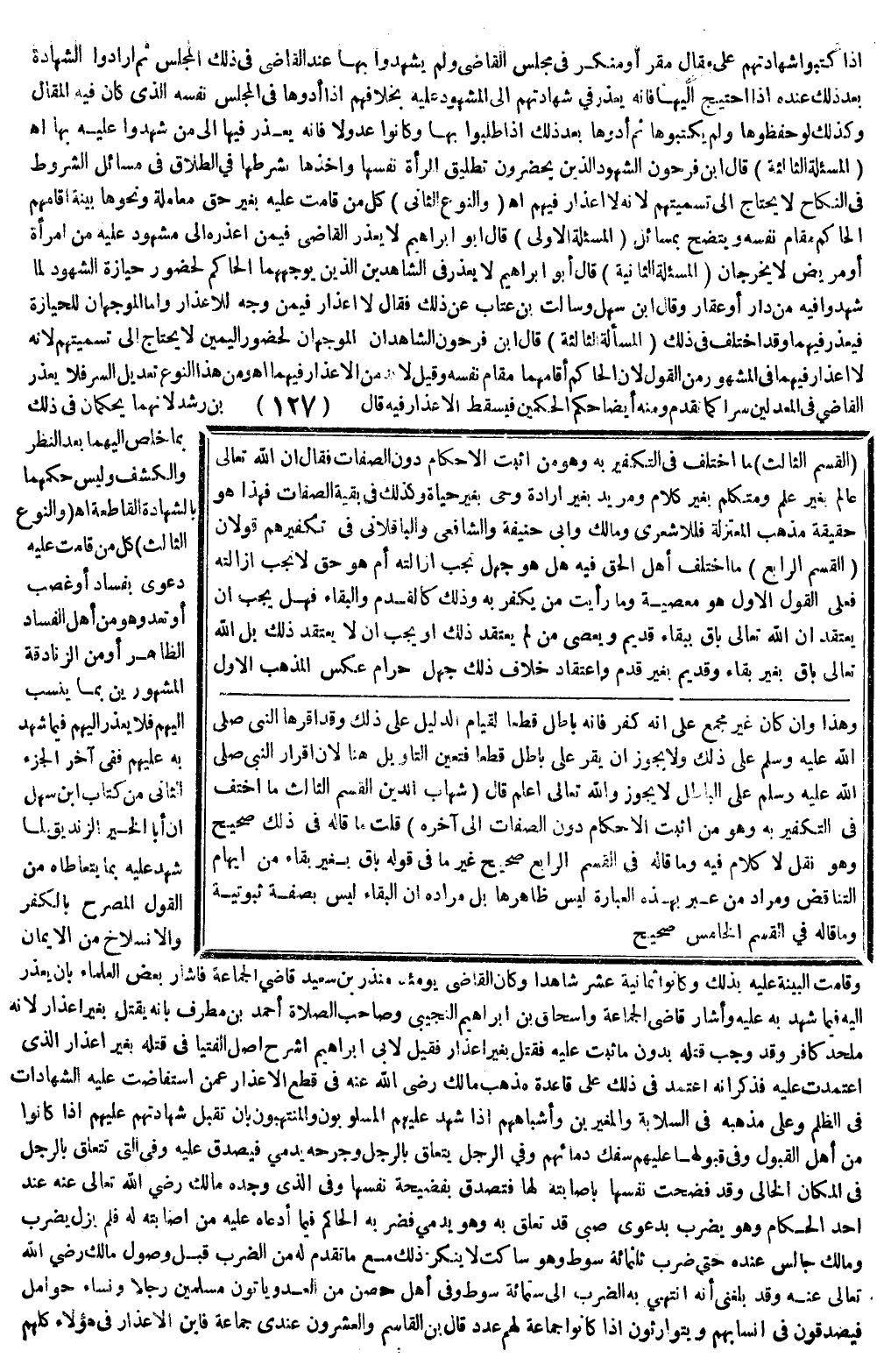 قَالَ: (شِهَابُ الدِّينِ الْقِسْمُ الثَّالِثُ مَا اُخْتُلِفَ فِي التَّكْفِيرِ بِهِ وَهُوَ مَنْ أَثْبَتَ الْأَحْكَامَ دُونَ الصِّفَاتِ إلَى آخِرِهِ) قُلْتُ: مَا قَالَهُ فِي ذَلِكَ صَحِيحٌ وَهُوَ نَقْلٌ لَا كَلَامَ فِيهِ، وَمَا قَالَهُ فِي الْقِسْمِ الرَّابِعِ صَحِيحٌ غَيْرَ مَا فِي قَوْلِ بَاقٍ بِغَيْرِ بَقَاءٍ مِنْ إيهَامِ التَّنَاقُضِ، وَمُرَادُ مَنْ عَبَّرَ بِهَذِهِ الْعِبَارَةِ لَيْسَ ظَاهِرُهَا بَلْ مُرَادُهُ أَنَّ الْبَقَاءَ لَيْسَ بِصِفَةٍ ثُبُوتِيَّةٍ، وَمَا قَالَهُ فِي الْقِسْمِ الْخَامِسِ صَحِيحٌ