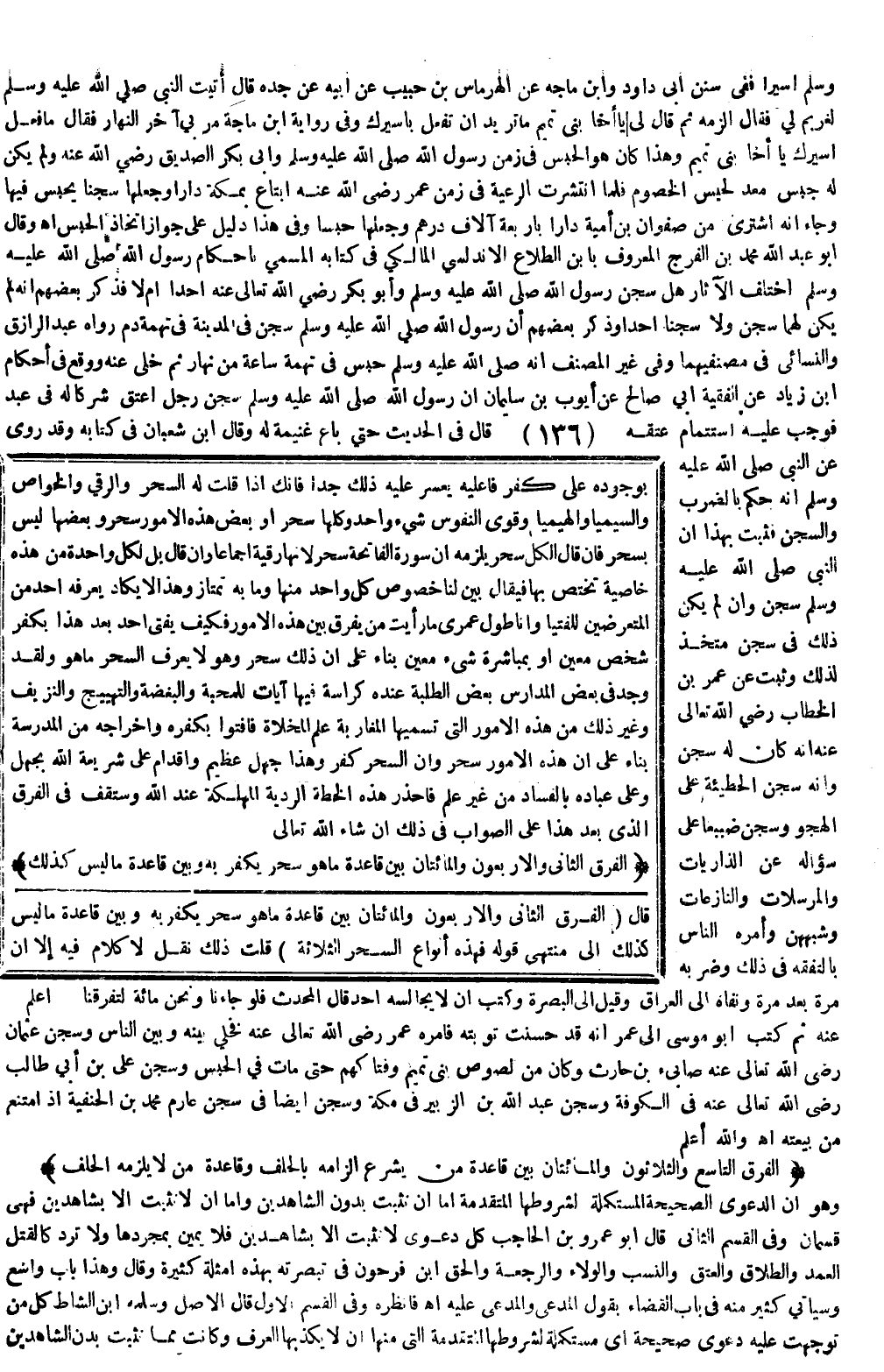 وَقَالَ أَبُو عَبْدِ اللَّهِ مُحَمَّدُ بْنُ الْفَرَجِ الْمَعْرُوفُ بِابْنِ الطَّلَّاعِ الْأَنْدَلُسِيِّ الْمَالِكِيِّ فِي كِتَابِهِ الْمُسَمَّى بِأَحْكَامِ رَسُولِ اللَّهِ - صَلَّى اللَّهُ عَلَيْهِ وَسَلَّمَ - اخْتَلَفَتْ الْآثَارُ هَلْ سَجَنَ رَسُولُ اللَّهِ - صَلَّى اللَّهُ عَلَيْهِ وَسَلَّمَ - وَأَبُو بَكْرٍ - رَضِيَ اللَّهُ تَعَالَى عَنْهُ - أَحَدًا أَمْ لَا فَذَكَرَ بَعْضُهُمْ أَنَّهُ لَمْ يَكُنْ لَهُمَا سِجْنٌ، وَلَا سَجَنَا أَحَدًا، وَذَكَرَ بَعْضُهُمْ «أَنَّ رَسُولَ اللَّهِ - صَلَّى اللَّهُ عَلَيْهِ وَسَلَّمَ - سَجَنَ فِي الْمَدِينَةِ فِي تُهْمَةِ دَمٍ» رَوَاهُ عَبْدُ الرَّزَّاقِ وَالنَّسَائِيُّ فِي مُصَنَّفَيْهِمَا، وَفِي غَيْرِ الْمُصَنَّفِ «أَنَّهُ - صَلَّى اللَّهُ عَلَيْهِ وَسَلَّمَ - حَبَسَ فِي تُهْمَةٍ سَاعَةً مِنْ نَهَارٍ ثُمَّ خَلَّى عَنْهُ» .