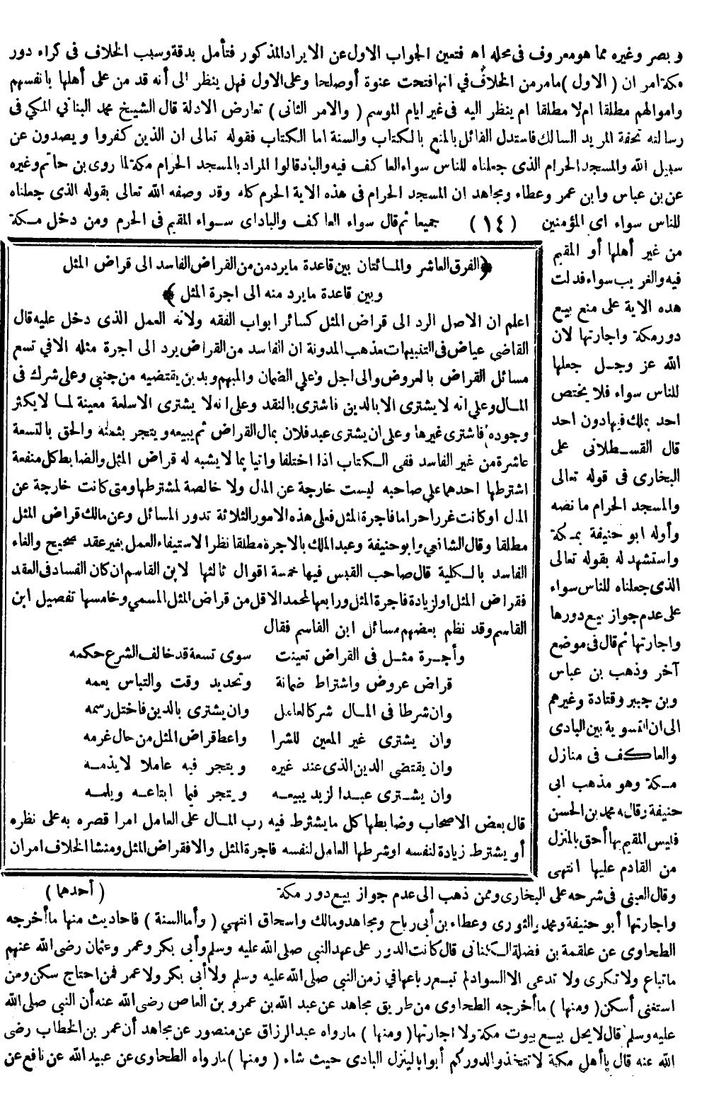 قَالَ الشَّيْخُ مُحَمَّدٌ الْبُنَانِيُّ الْمَكِّيُّ فِي رِسَالَتِهِ تُحْفَةِ الْمُرِيدِ السَّالِكِ فَاسْتَدَلَّ الْقَائِلُ بِالْمَنْعِ بِالْكِتَابِ وَالسُّنَّةِ أَمَّا الْكِتَابُ فَقَوْلُهُ تَعَالَى {إِنَّ الَّذِينَ كَفَرُوا وَيَصُدُّونَ عَنْ سَبِيلِ اللَّهِ وَالْمَسْجِدِ الْحَرَامِ الَّذِي جَعَلْنَاهُ لِلنَّاسِ سَوَاءً الْعَاكِفُ فِيهِ وَالْبَادِ} [الحج: 25] قَالُوا الْمُرَادُ بِالْمَسْجِدِ الْحَرَامِ مَكَّةَ لِمَا رَوَى ابْنُ حَاتِمٍ، وَغَيْرُهُ عَنْ ابْنِ عَبَّاسٍ وَابْنِ عُمَرَ وَعَطَاءٍ وَمُجَاهِدٍ أَنَّ الْمَسْجِدَ الْحَرَامَ فِي هَذِهِ الْآيَةِ الْحَرَمُ كُلُّهُ، وَقَدْ وَصَفَهُ اللَّهُ تَعَالَى بِقَوْلِهِ {الَّذِي جَعَلْنَاهُ لِلنَّاسِ سَوَاءً} [الحج: 25] أَيْ الْمُؤْمِنِينَ جَمِيعًا ثُمَّ قَالَ {سَوَاءً الْعَاكِفُ فِيهِ وَالْبَادِ} [الحج: 25] أَيْ سَوَاءً الْمُقِيمُ فِي الْحَرَمِ، وَمَنْ دَخَلَ مَكَّةَ مِنْ غَيْرِ أَهْلِهَا أَوْ الْمُقِيمُ فِيهِ، وَالْغَرِيبُ سَوَاءٌ فَدَلَّتْ هَذِهِ الْآيَةُ عَلَى مَنْعِ بَيْعِ دُورِ مَكَّةَ وَإِجَارَتِهَا لِأَنَّ اللَّهَ عَزَّ وَجَلَّ جَعَلَهَا لِلنَّاسِ سَوَاءً فَلَا يَخْتَصُّ أَحَدٌ بِمِلْكٍ فِيهَا دُونَ أَحَدٍ قَالَ الْقَسْطَلَّانِيُّ عَلَى الْبُخَارِيِّ فِي قَوْله تَعَالَى {وَالْمَسْجِدِ الْحَرَامِ} [الحج: 25] مَا نَصُّهُ وَأَوَّلَهُ أَبُو حَنِيفَةَ بِمَكَّةَ، وَاسْتَشْهَدَ لَهُ بِقَوْلِهِ تَعَالَى {الَّذِي جَعَلْنَاهُ لِلنَّاسِ سَوَاءً} [الحج: 25] عَلَى عَدَمِ جَوَازِ بَيْعِ دُورِهَا وَإِجَارَتِهَا ثُمَّ قَالَ فِي مَوْضِعٍ آخَرَ، وَذَهَبَ ابْنُ عَبَّاسٍ وَابْنُ جُبَيْرٍ وَقَتَادَةُ، وَغَيْرُهُمْ إلَى أَنَّ التَّسْوِيَةَ بَيْنَ الْبَادِي وَالْعَاكِفِ فِي مَنَازِلِ مَكَّةَ، وَهُوَ مَذْهَبُ أَبِي حَنِيفَةَ.