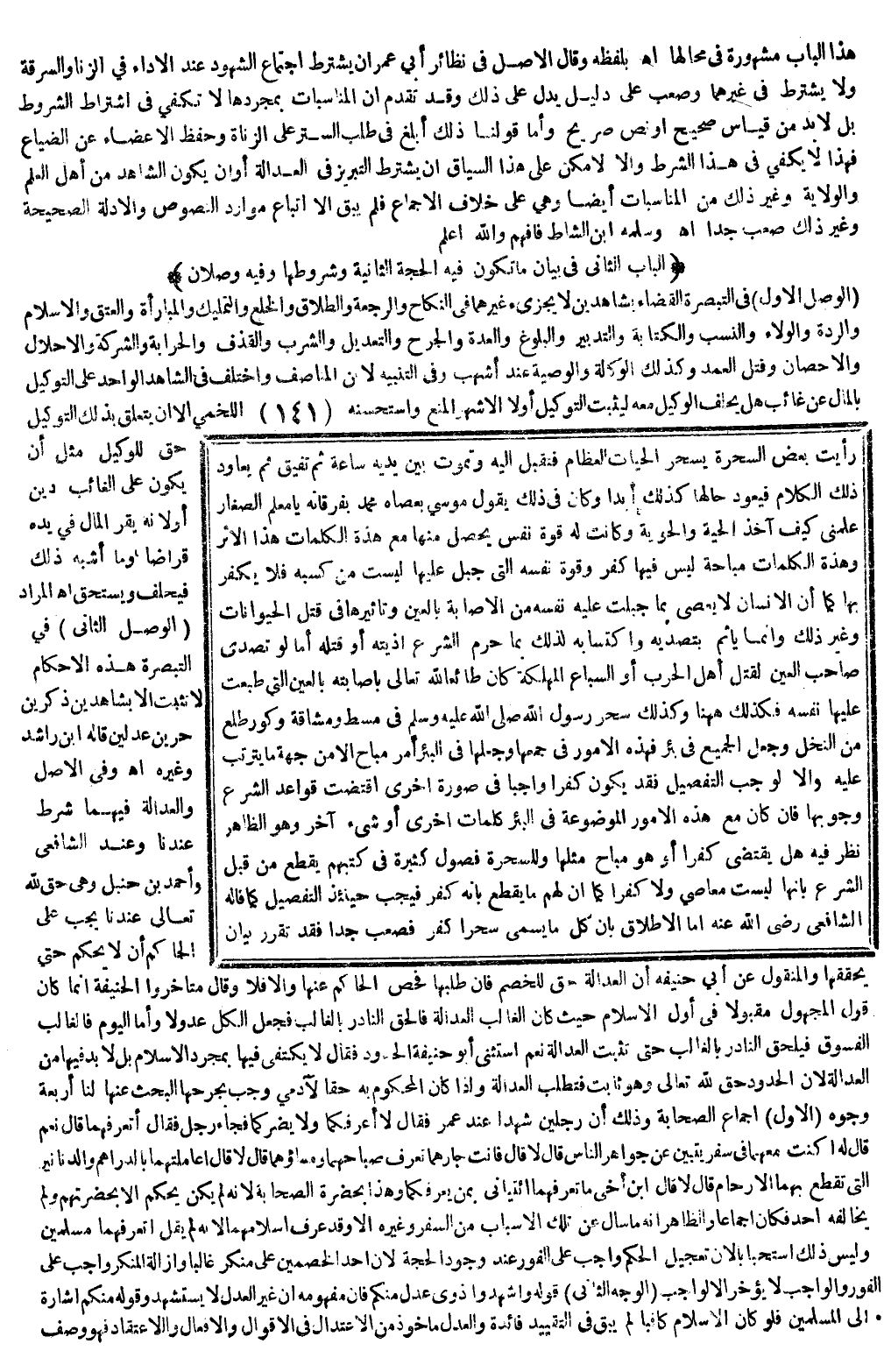 (الْوَصْلُ الْأَوَّلُ) فِي التَّبْصِرَةِ الْقَضَاءُ بِشَاهِدَيْنِ لَا يُجْزِئُ غَيْرُهُمَا فِي النِّكَاحِ وَالرَّجْعَةِ وَالطَّلَاقِ وَالْخُلْعِ وَالتَّمْلِيكِ وَالْمُبَارَأَةِ وَالْعِتْقِ وَالْإِسْلَامِ وَالرِّدَّةِ وَالْوَلَاءِ وَالنَّسَبِ وَالْكِتَابَةِ وَالتَّدْبِيرِ وَالْبُلُوغِ وَالْعِدَّةِ وَالْجَرْحِ وَالتَّعْدِيلِ وَالشُّرْبِ وَالْقَذْفِ وَالْحِرَابَةِ وَالشَّرِكَةِ وَالْإِحْلَالِ وَالْإِحْصَانِ وَقَتْلِ الْعَمْدِ، وَكَذَلِكَ الْوَكَالَةُ