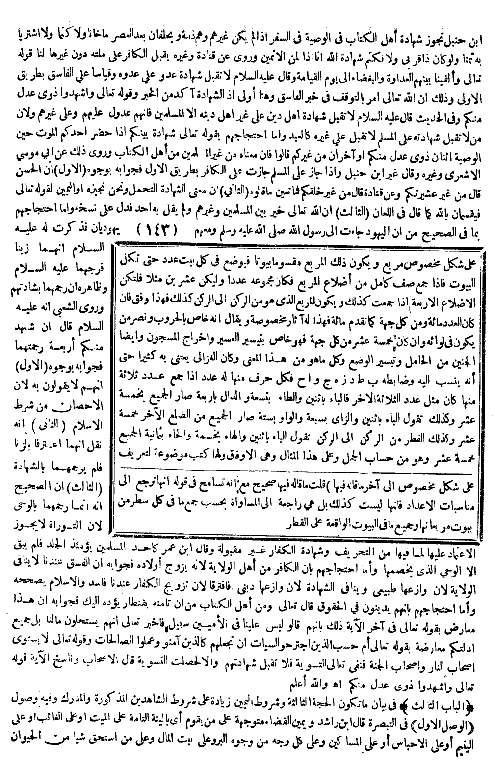 وَأَمَّا احْتِجَاجُهُمْ بِقَوْلِهِ تَعَالَى {شَهَادَةُ بَيْنِكُمْ إِذَا حَضَرَ أَحَدَكُمُ الْمَوْتُ حِينَ الْوَصِيَّةِ اثْنَانِ ذَوَا عَدْلٍ مِنْكُمْ أَوْ آخَرَانِ مِنْ غَيْرِكُمْ} [المائدة: 106] قَالُوا فَإِنَّ مَعْنَاهُ مِنْ غَيْرِ الْمُسْلِمِينَ مِنْ أَهْلِ الْكِتَابِ، وَرُوِيَ ذَلِكَ عَنْ أَبِي مُوسَى الْأَشْعَرِيِّ وَغَيْرِهِ، وَقَالَ غَيْرُ ابْنِ حَنْبَلٍ وَإِذَا جَازَ عَلَى الْمُسْلِمِ جَازَتْ عَلَى الْكَافِرِ بِطَرِيقِ الْأَوْلَى فَجَوَابُهُ بِوُجُوبِهِ (الْأَوَّلُ) أَنَّ الْحَسَنَ قَالَ مِنْ غَيْرِ عَشِيرَتِكُمْ، وَعَنْ قَتَادَةَ قَالَ مِنْ غَيْرِ حِلْفِكُمْ فَمَا تَعَيَّنَ مَا قَالُوهُ.