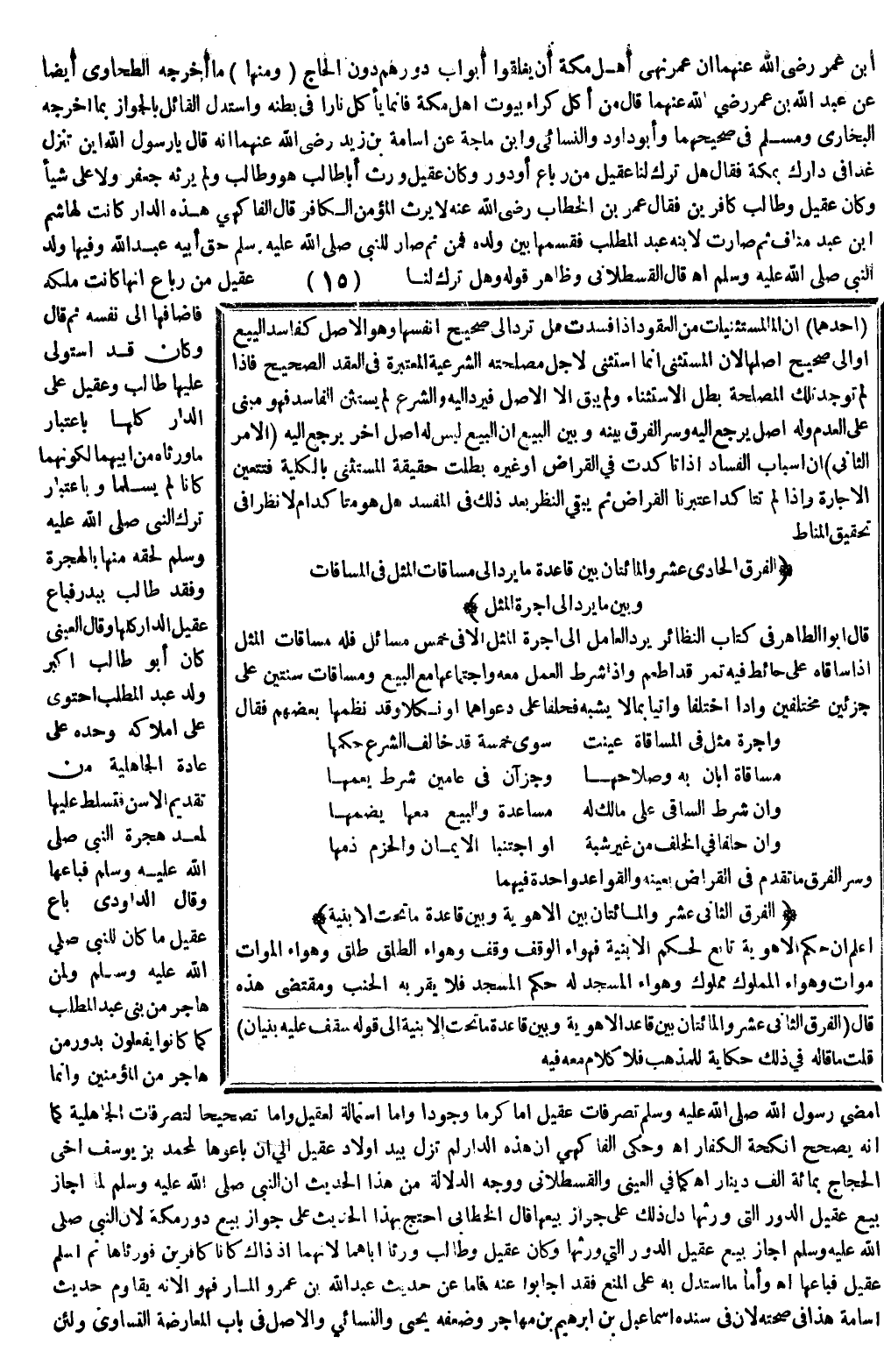 وَقَالَ الْعَيْنِيُّ كَانَ أَبُو طَالِبٍ أَكْبَرَ وَلَدِ عَبْدِ الْمُطَّلِبِ احْتَوَى عَلَى أَمْلَاكِهِ وَحْدَهُ عَلَى عَادَةِ الْجَاهِلِيَّةِ مِنْ تَقْدِيمِ الْأَسَنِّ فَتَسَلَّطَ عَلَيْهَا عَقِيلٌ بَعْدَ هِجْرَةِ النَّبِيِّ - صَلَّى اللَّهُ عَلَيْهِ وَسَلَّمَ - فَبَاعَهَا، وَقَالَ الدَّاوُدِيُّ بَاعَ عَقِيلٌ مَا كَانَ لِلنَّبِيِّ - صَلَّى اللَّهُ عَلَيْهِ وَسَلَّمَ -، وَلِمَنْ هَاجَرَ مِنْ بَنِي عَبْدِ الْمُطَّلِبِ كَمَا كَانُوا يَفْعَلُونَ بِدُورِ مَنْ هَاجَرَ مِنْ الْمُؤْمِنِينَ، وَإِنَّمَا أَمْضَى رَسُولُ اللَّهِ - صَلَّى اللَّهُ عَلَيْهِ وَسَلَّمَ - تَصَرُّفَاتِ عَقِيلٍ إمَّا كَرَمًا وُجُودًا، وَإِمَّا اسْتِمَالَةً لِعَقِيلٍ، وَإِمَّا تَصْحِيحًا لِتَصَرُّفَاتِ الْجَاهِلِيَّةِ كَمَا أَنَّهُ يَصِحُّ أَنْكِحَةُ الْكُفَّارِ اهـ.
