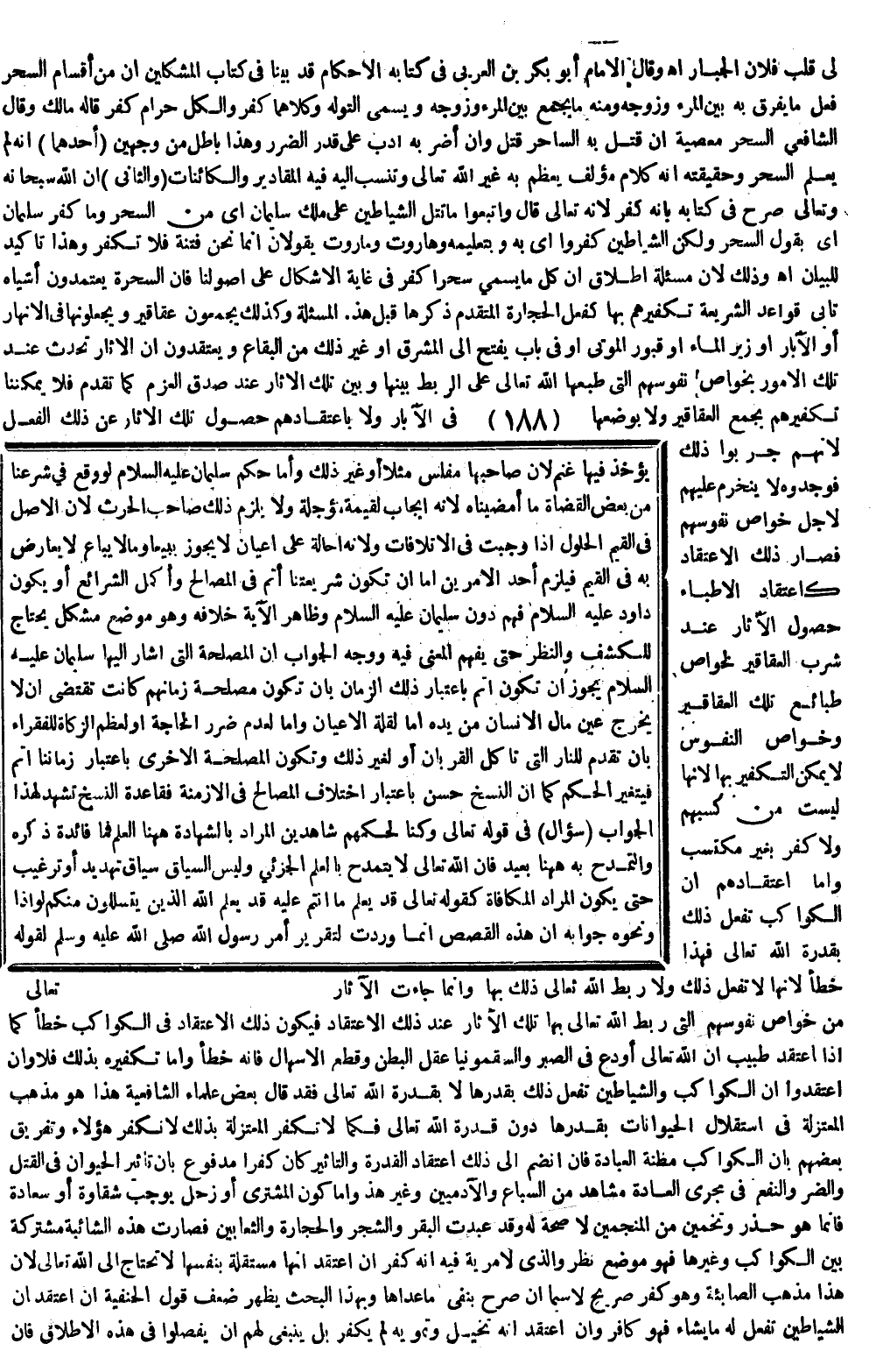 وَقَالَ الْإِمَامُ أَبُو بَكْرِ بْنُ الْعَرَبِيِّ فِي كِتَابِهِ الْأَحْكَامِ قَدْ بَيَّنَّا فِي كِتَابِ الْمُشْكِلِينَ أَنَّ مِنْ أَقْسَامِ السِّحْرِ فِعْلَ مَا يُفَرِّقُ بِهِ بَيْنَ الْمَرْءِ وَزَوْجِهِ وَمِنْهُ مَا يَجْمَعُ بَيْنَ الْمَرْءِ وَزَوْجِهِ وَيُسَمَّى التُّوَلَةَ، وَكِلَاهُمَا كُفْرٌ وَالْكُلُّ حَرَامٌ كُفْرٌ قَالَهُ مَالِكٌ وَقَالَ الشَّافِعِيُّ السِّحْرُ مَعْصِيَةٌ إنْ قَتَلَ بِهِ السَّاحِرُ قُتِلَ، وَإِنْ أَضَرَّ بِهِ أُدِّبَ عَلَى قَدْرِ الضَّرَرِ، وَهَذَا بَاطِلٌ مِنْ وَجْهَيْنِ. (أَحَدِهِمَا) أَنَّهُ لَمْ يَعْلَمْ السِّحْرَ، وَحَقِيقَتُهُ أَنَّهُ كَلَامٌ مُؤَلَّفٌ يُعَظَّمُ بِهِ غَيْرُ اللَّهِ تَعَالَى، وَتُنْسَبُ إلَيْهِ فِيهِ الْمَقَادِيرُ وَالْكَائِنَاتُ.