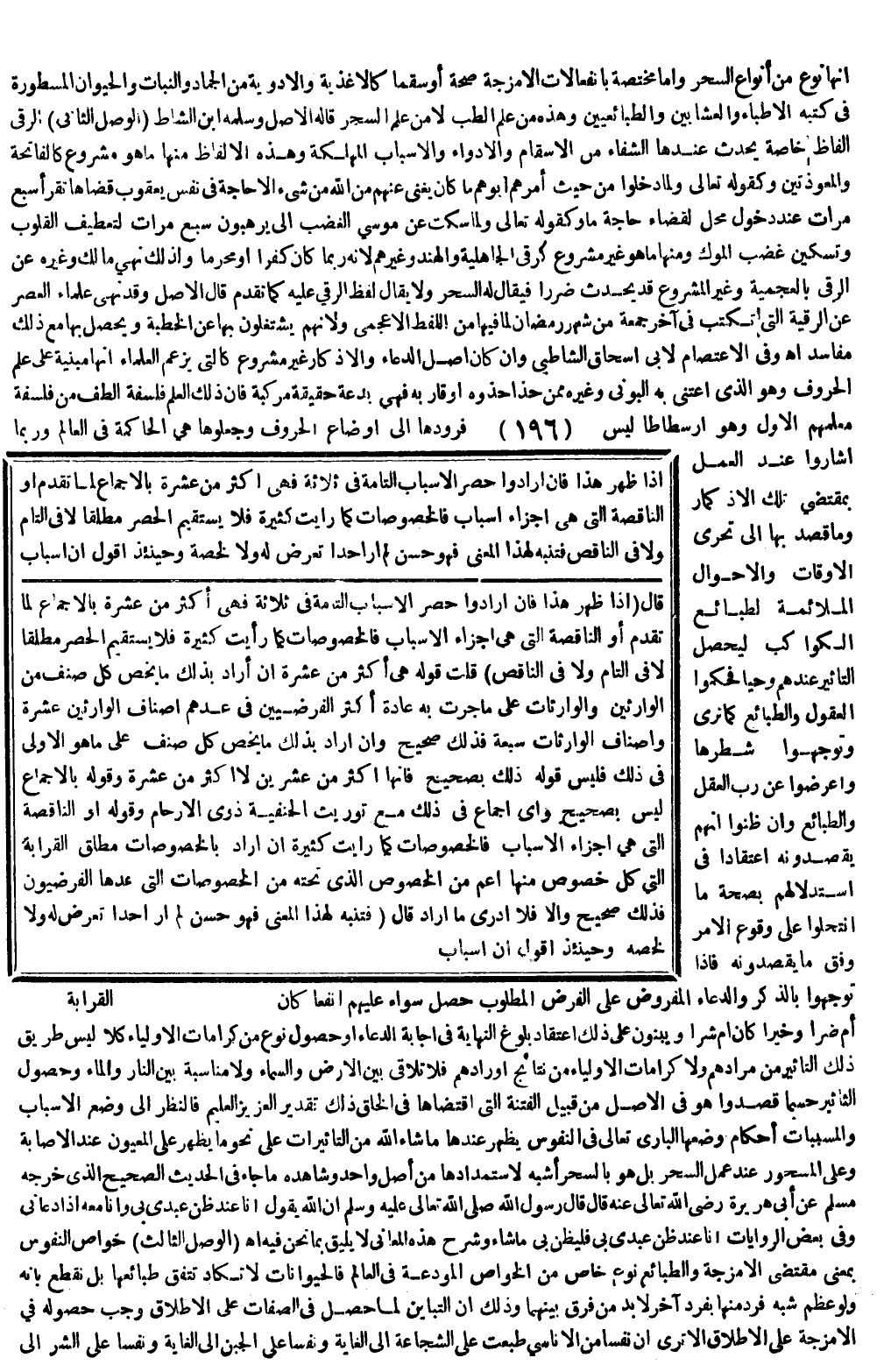 ـــــــــــــــــــــــــــــQأَنَّهَا نَوْعٌ مِنْ أَنْوَاعِ السِّحْرِ، وَإِمَّا مُخْتَصَّةٌ بِانْفِعَالَاتِ الْأَمْزِجَةِ صِحَّةً أَوْ سَقَمًا كَالْأَغْذِيَةِ وَالْأَدْوِيَةِ مِنْ الْجَمَادِ وَالنَّبَاتِ وَالْحَيَوَانِ الْمَسْطُورَةِ فِي كُتُبِ الْأَطِبَّاءِ وَالْعَشَّابِينَ والطبائعيين وَهَذِهِ مِنْ عِلْمِ الطِّبِّ لَا مِنْ عِلْمِ السِّحْرِ قَالَهُ الْأَصْلُ، وَسَلَّمَهُ ابْنُ الشَّاطِّ.