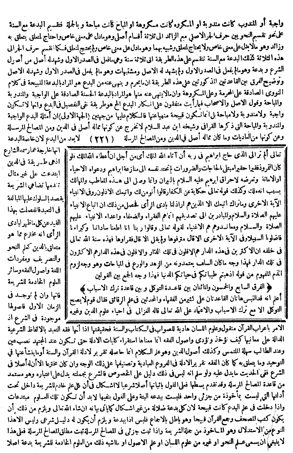 وَإِنْ لَمْ تُوجَدْ فِي الزَّمَانِ الْأَوَّلِ فَأُصُولُهَا مَوْجُودَةٌ فِي الشَّرْعِ؛ إذْ الْأَمْرُ بِإِعْرَابِ الْقُرْآنِ مَنْقُولٌ، وَعُلُومُ اللِّسَانِ هَادِيَةٌ لِلصَّوَابِ فِي الْكِتَابِ وَالسُّنَّةِ فَحَقِيقَتُهَا إذًا أَنَّهَا فِقْهُ التَّعَبُّدِ بِالْأَلْفَاظِ الشَّرْعِيَّةِ الدَّالَّةِ عَلَى مَعَانِيهَا كَيْفَ تُؤْخَذُ وَتُؤَدَّى، وَأُصُولُ الْفِقْهِ إنَّمَا مَعْنَاهَا اسْتِقْرَاءُ كُلِّيَّاتِ الْأَدِلَّةِ حَتَّى تَكُونَ عِنْدَ الْمُجْتَهِدِ نَصْبَ عَيْنٍ، وَعِنْدَ الطَّالِبِ سَهْلَةَ الْمُلْتَمَسِ، وَكَذَلِكَ أُصُولُ الدِّينِ، وَهُوَ عِلْمُ الْكَلَامِ إنَّمَا حَاصِلُهُ تَقْرِيرٌ لِأَدِلَّةِ الْقُرْآنِ وَالسُّنَّةِ أَوْ مَا يَنْشَأُ عَنْهَا فِي التَّوْحِيدِ وَمَا يَتَعَلَّقُ بِهِ كَمَا كَانَ الْفِقْهُ تَقْرِيرَ الْأَدِلَّةِ فِي الْفُرُوعِ الْعَبَّادِيَّةِ، وَتَصْنِيفُهَا عَلَى ذَلِكَ الْوَجْهِ، وَإِنْ كَانَ مُخْتَرَعًا إلَّا أَنَّ لَهُ أَصْلًا فِي الشَّرْعِ فَفِي الْحَدِيثِ مَا يَدُلُّ عَلَيْهِ وَلَوْ سُلِّمَ أَنَّهُ لَيْسَ فِي ذَلِكَ دَلِيلٌ عَلَى الْخُصُوصِ فَالشَّرْعُ بِجُمْلَتِهِ يَدُلُّ عَلَى اعْتِبَارِهِ، وَهُوَ مُسْتَمَدٌّ مِنْ قَاعِدَةِ الْمَصَالِحِ الْمُرْسَلَةِ.