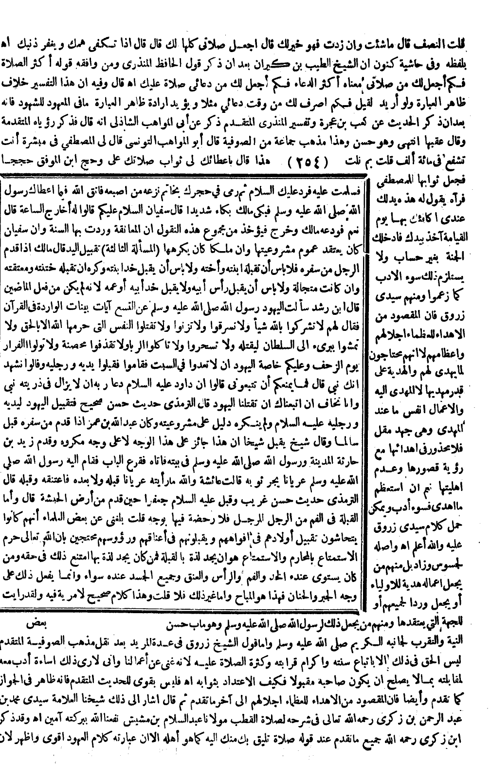 ـــــــــــــــــــــــــــــQقُلْت النِّصْفَ قَالَ مَا شِئْت، وَإِنْ زِدْت فَهُوَ خَيْرٌ لَك قَالَ: أَجْعَلُ صَلَاتِي كُلَّهَا لَك قَالَ قَالَ إذًا تُكْفَى هَمَّك وَيُغْفَرُ ذَنْبُك» اهـ بِلَفْظِهِ، وَفِي حَاشِيَةِ كَنُونٍ أَنَّ الشَّيْخَ الطَّيِّبَ بْنَ كَيْرَانِ بَعْدَ أَنْ ذَكَرَ قَوْلَهُ الْحَافِظُ الْمُنْذِرِيُّ وَمَنْ وَافَقَهُ قَوْلُهُ: أُكْثِرُ الصَّلَاةَ فَكَمْ أَجْعَلُ لَك مِنْ صَلَاتِي مَعْنَاهُ أُكْثِرُ الدُّعَاءَ فَكَمْ أَجْعَلُ لَك مِنْ دُعَائِي صَلَاةً عَلَيْك اهـ قَالَ: وَفِيهِ أَنَّ هَذَا التَّفْسِيرَ خِلَافُ ظَاهِرِ الْعِبَارَةِ، وَلَوْ أُرِيدَ لَقِيلَ: فَكَمْ أَصْرِفُ لَك مِنْ وَقْتِ دُعَائِي مَثَلًا، وَيُؤَيِّدُ إرَادَةَ ظَاهِرِ الْعِبَارَةِ مَا فِي الْمَعْهُودِ لِلشُّهُودِ فَإِنَّهُ بَعْدَ أَنْ ذَكَرَ الْحَدِيثَ عَنْ كَعْبِ بْنِ عُجْرَةَ، وَتَفْسِيرُ الْمُنْذِرِيِّ الْمُتَقَدِّمُ ذُكِرَ عَنْ أَبِي الْمَوَاهِبِ الشَّاذِلِيِّ أَنَّهُ قَالَ فَذَكَرَ رُؤْيَاهُ الْمُتَقَدِّمَةَ، وَقَالَ عَقِبَهَا: انْتَهَى، وَهُوَ حَسَنٌ.