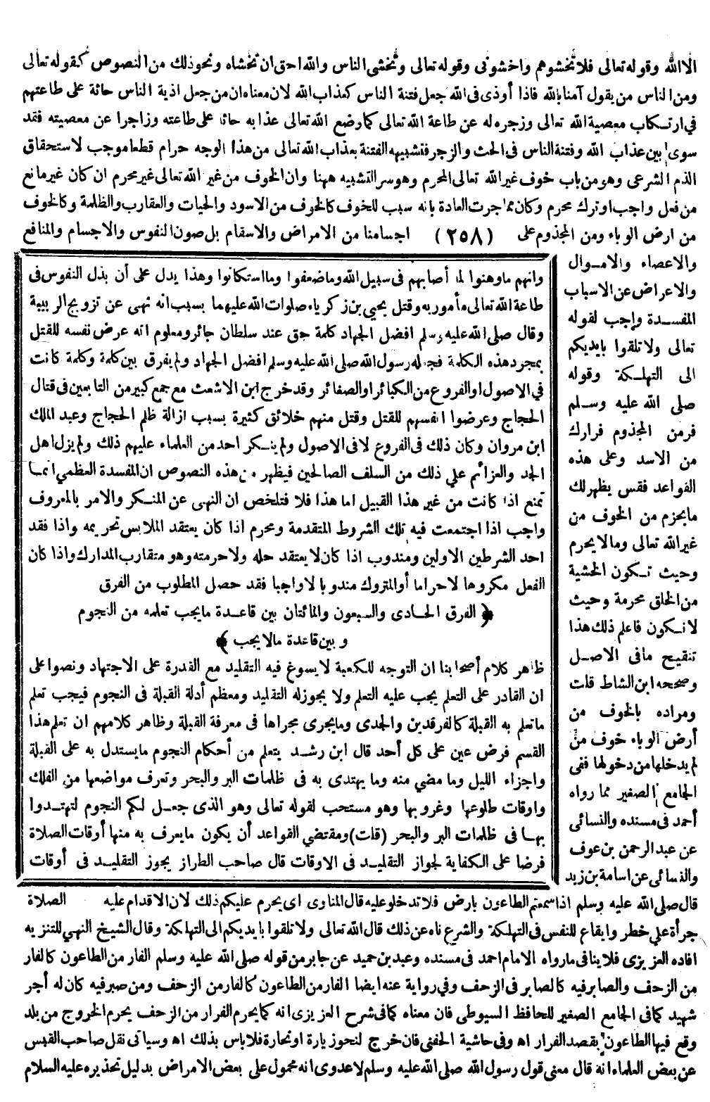 وَقَوْلُهُ: - صَلَّى اللَّهُ عَلَيْهِ وَسَلَّمَ - «فِرَّ مِنْ الْمَجْذُومِ فِرَارَك مِنْ الْأَسَدِ» وَعَلَى هَذِهِ الْقَوَاعِدِ فَقِسْ يَظْهَرْ لَك مَا يَحْرُمُ مِنْ الْخَوْفِ مِنْ غَيْرِ اللَّهِ - تَعَالَى - وَمَا لَا يَحْرُمُ، وَحَيْثُ تَكُونُ الْخَشْيَةُ مِنْ الْخَلْقِ مُحَرَّمَةً، وَحَيْثُ لَا تَكُونُ فَاعْلَمْ ذَلِكَ، هَذَا تَنْقِيحُ مَا فِي الْأَصْلِ، وَصَحَّحَهُ ابْنُ الشَّاطِّ قُلْت: وَمُرَادُهُ بِالْخَوْفِ مِنْ أَرْضِ الْوَبَاءِ خَوْفُ مَنْ لَمْ يَدْخُلْهَا مِنْ دُخُولِهَا فَفِي الْجَامِعِ الصَّغِيرِ مِمَّا رَوَاهُ أَحْمَدُ فِي مُسْنَدِهِ وَالنَّسَائِيُّ عَنْ عَبْدِ الرَّحْمَنِ بْنِ عَوْفٍ وَالنَّسَائِيُّ عَنْ أُسَامَةَ بْنِ زَيْدٍ قَالَ - صَلَّى اللَّهُ عَلَيْهِ وَسَلَّمَ - «إذَا سَمِعْتُمْ الطَّاعُونَ بِأَرْضٍ فَلَا تَدْخُلُوا عَلَيْهِ» قَالَ الْمُنَاوِيُّ: أَيْ يَحْرُمُ عَلَيْكُمْ ذَلِكَ؛ لِأَنَّ الْإِقْدَامَ عَلَيْهِ جُرْأَةٌ عَلَى خَطَرٍ وَإِيقَاعٌ لِلنَّفْسِ فِي التَّهْلُكَةِ وَالشَّرْعُ نَاهٍ عَنْ ذَلِكَ قَالَ اللَّه - تَعَالَى - {وَلا تُلْقُوا بِأَيْدِيكُمْ إِلَى التَّهْلُكَةِ} [البقرة: 195] وَقَالَ الشَّيْخُ: النَّهْيُ لِلتَّنْزِيهِ أَفَادَهُ الْعَزِيزِيُّ فَلَا يُنَافِي مَا رَوَاهُ الْإِمَامُ أَحْمَدُ فِي مُسْنَدِهِ وَعَبْدُ بْنُ حُمَيْدٍ عَنْ جَابِرٍ مِنْ قَوْلِهِ - صَلَّى اللَّهُ عَلَيْهِ وَسَلَّمَ - «الْفَارُّ مِنْ الطَّاعُون كَالْفَارِّ مِنْ الزَّحْفِ، وَالصَّابِرُ فِيهِ كَالصَّابِرِ فِي الزَّحْفِ» وَفِي رِوَايَةٍ عَنْهُ أَيْضًا «الْفَارُّ مِنْ الطَّاعُونِ كَالْفَارِّ مِنْ الزَّحْفِ، وَمَنْ صَبَرَ فِيهِ كَانَ لَهُ أَجْرُ شَهِيدٍ» كَمَا فِي الْجَامِعِ الصَّغِيرِ لِلْحَافِظِ السُّيُوطِيّ فَإِنَّ مَعْنَاهُ كَمَا فِي شَرْحِ الْعَزِيزِيِّ أَنَّهُ كَمَا يَحْرُمُ الْفِرَارُ مِنْ الزَّحْفِ يَحْرُمُ الْخُرُوجُ مِنْ بَلَدٍ وَقَعَ فِيهَا الطَّاعُونُ بِقَصْدِ الْفِرَارِ اهـ وَفِي حَاشِيَةِ الْحِفْنِيِّ فَإِنْ خَرَجَ لِنَحْوِ زِيَارَةٍ أَوْ تِجَارَةٍ فَلَا بَأْسَ بِذَلِكَ. اهـ.