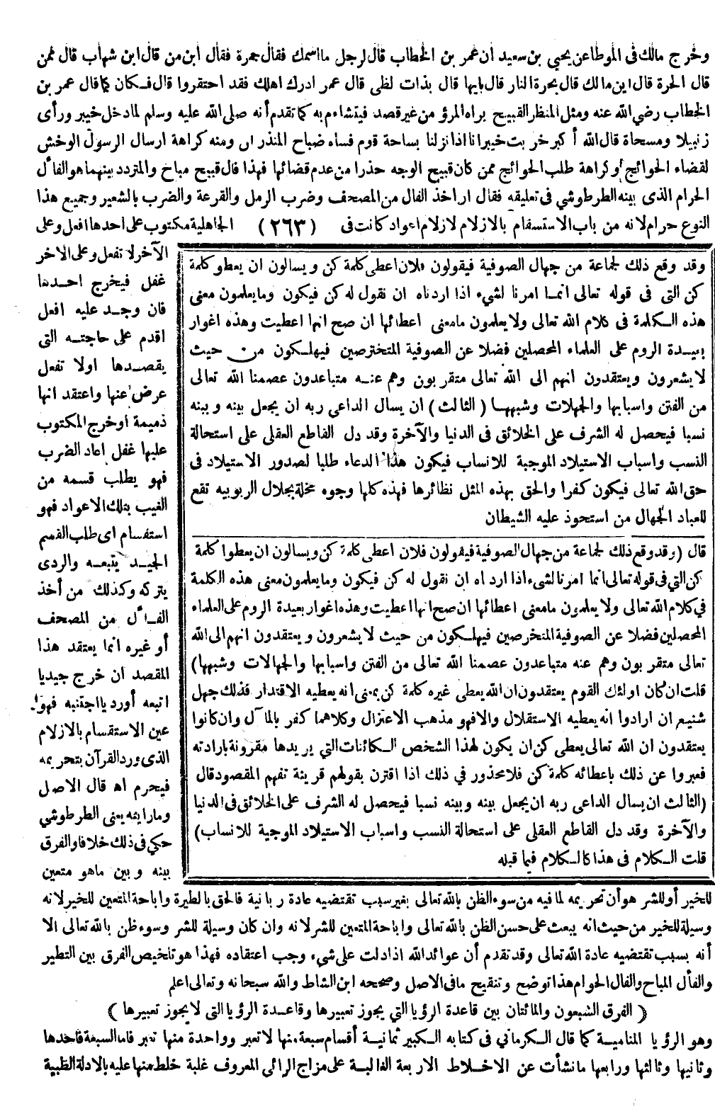 وَضَرْبَ الرَّمْلِ وَالْقُرْعَةِ، وَالضَّرْبَ بِالشَّعِيرِ، وَجَمِيعَ هَذَا النَّوْعِ حَرَامٌ؛ لِأَنَّهُ مِنْ بَابِ الِاسْتِقْسَامِ بِالْأَزْلَامِ لِأَزْلَامِ أَعْوَادٍ كَانَتْ فِي الْجَاهِلِيَّةِ مَكْتُوبٌ عَلَى أَحَدِهَا افْعَلْ، وَعَلَى الْآخَرِ لَا تَفْعَلْ، وَعَلَى الْآخَرِ غُفْلٌ فَيَخْرُجُ أَحَدُهَا، فَإِنْ وَجَدَ عَلَيْهِ افْعَلْ أَقْدَمَ عَلَى حَاجَتِهِ الَّتِي يَقْصِدُهَا أَوْ لَا تَفْعَلْ أَعْرَضَ عَنْهَا، وَاعْتَقَدَ أَنَّهَا ذَمِيمَةٌ أَوْ خَرَجَ الْمَكْتُوبُ عَلَيْهَا غُفْلٌ أَعَادَ الضَّرْبَ فَهُوَ يَطْلُبُ قِسْمَهُ مِنْ الْغَيْبِ بِتِلْكَ الْأَعْوَادِ فَهُوَ اسْتِقْسَامٌ أَيْ طَلَبُ الْقَسْمِ، الْجَيِّدُ يَتْبَعُهُ وَالرَّدِيء يَتْرُكُهُ، وَكَذَلِكَ مَنْ أَخَذَ الْفَأْلَ مِنْ الْمُصْحَفِ أَوْ غَيْرِهِ إنَّمَا يَعْتَقِدُ هَذَا الْمَقْصِدَ إنْ خَرَجَ جَيِّدًا اتَّبَعَهُ أَوْ رَدِيئًا اجْتَنَبَهُ فَهُوَ عَيْنُ الِاسْتِقْسَامِ بِالْأَزْلَامِ الَّذِي وَرَدَ الْقُرْآنُ بِتَحْرِيمِهِ فَيَحْرُمُ اهـ قَالَ الْأَصْلُ: وَمَا رَأَيْتُهُ يَعْنِي الطُّرْطُوشِيَّ حَكَى فِي ذَلِكَ خِلَافًا، وَالْفَرْقُ بَيْنَهُ وَبَيْنَ مَا هُوَ مُتَعَيِّنٌ لِلْخَيْرِ أَوْ لِلشَّرِّ هُوَ أَنَّ تَحْرِيمَهُ لِمَا فِيهِ مِنْ سُوءِ الظَّنِّ بِاَللَّهِ - تَعَالَى - بِغَيْرِ سَبَبٍ تَقْتَضِيهِ عَادَةٌ رَبَّانِيَّةٌ فَالْحَقُّ بِالطِّيَرَةِ وَإِبَاحَةِ الْمُتَعَيِّنِ لِلْخَيْرِ؛ لِأَنَّهُ وَسِيلَةٌ لِلْخَيْرِ مِنْ حَيْثُ إنَّهُ يَبْعَثُ عَلَى حُسْنِ الظَّنِّ بِاَللَّهِ - تَعَالَى - وَإِبَاحَةِ الْمُتَعَيِّنِ لِلشَّرِّ؛ لِأَنَّهُ، وَإِنْ كَانَ وَسِيلَةً لِلشَّرِّ وَسُوءِ ظَنٍّ بِاَللَّهِ - تَعَالَى - إلَّا أَنَّهُ بِسَبَبٍ تَقْتَضِيهِ عَادَةُ اللَّهِ - تَعَالَى - وَقَدْ تَقَدَّمَ أَنَّ عَوَائِدَ اللَّهِ إذَا دَلَّتْ عَلَى شَيْءٍ وَجَبَ اعْتِقَادُهُ فَهَذَا هُوَ تَلْخِيصُ الْفَرْقِ بَيْنَ التَّطَيُّرِ وَالْفَأْلِ الْمُبَاحِ وَالْفَأْلِ الْحَرَامِ هَذَا تَوْضِيحُ وَتَنْقِيحُ مَا فِي الْأَصْلِ، وَصَحَّحَهُ ابْنُ الشَّاطِّ وَاَللَّهُ - سُبْحَانَهُ وَتَعَالَى - أَعْلَمُ.
