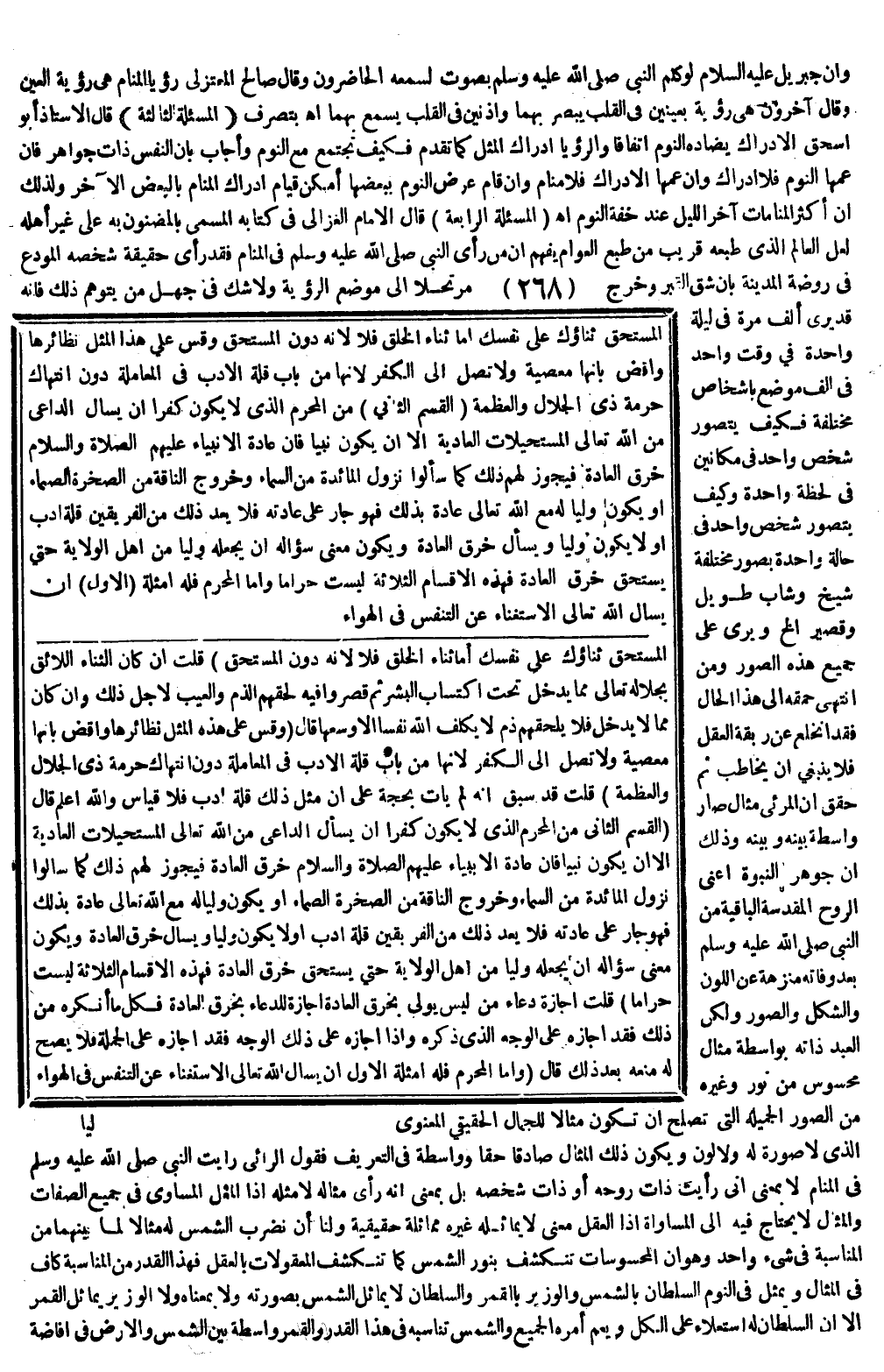 (الْمَسْأَلَةُ الرَّابِعَةُ) : قَالَ الْإِمَامُ الْغَزَالِيُّ فِي كِتَابِهِ الْمُسَمَّى بِالْمَضْنُونِ بِهِ عَلَى غَيْرِ أَهْلِهِ لَعَلَّ الْعَالِمَ الَّذِي طَبْعُهُ قَرِيبٌ مِنْ طَبْعِ الْعَوَامّ يَفْهَمُ أَنَّ مَنْ رَأَى النَّبِيَّ - صَلَّى اللَّهُ عَلَيْهِ وَسَلَّمَ - فِي الْمَنَامِ فَقَدْ رَأَى حَقِيقَةً شَخْصَهُ الْمُودَعَ فِي رَوْضَةِ الْمَدِينَةِ بِأَنْ شَقَّ الْقَبْرَ وَخَرَجَ مُرْتَحِلًا إلَى مَوْضِعِ الرُّؤْيَةِ، وَلَا شَكَّ فِي جَهْلِ مَنْ يَتَوَهَّمُ ذَلِكَ، فَإِنَّهُ قَدْ يُرَى أَلْفَ مَرَّةٍ فِي لَيْلَةٍ وَاحِدَةٍ فِي وَقْتٍ وَاحِدٍ فِي أَلْفِ مَوْضِعٍ بِأَشْخَاصٍ مُخْتَلِفَةٍ فَكَيْفَ يُتَصَوَّرُ شَخْصٌ وَاحِدٌ فِي مَكَانَيْنِ فِي لَحْظَةٍ وَاحِدَةٍ وَكَيْفَ يُتَصَوَّرُ شَخْصٌ وَاحِدٌ فِي حَالَةٍ وَاحِدَةٍ بِصُوَرٍ مُخْتَلِفَةٍ شَيْخٌ وَشَابٌّ طَوِيلٌ وَقَصِيرٌ إلَخْ وَيُرَى عَلَى جَمِيعِ هَذِهِ الصُّوَرِ وَمَنْ انْتَهَى حُمْقُهُ إلَى هَذَا الْحَالِ فَقَدْ انْخَلَعَ عَنْ رِبْقَةِ الْعَقْلِ فَلَا يَنْبَغِي أَنْ يُخَاطَبَ ثُمَّ حُقِّقَ أَنَّ الْمَرْئِيَّ مِثَالٌ صَارَ وَاسِطَةً بَيْنَهُ وَبَيْنَهُ وَذَلِكَ أَنَّ جَوْهَرَ النُّبُوَّةِ أَعْنِي الرُّوحَ الْمُقَدَّسَةَ الْبَاقِيَةَ مِنْ النَّبِيِّ - صَلَّى اللَّهُ عَلَيْهِ وَسَلَّمَ - بَعْدَ وَفَاتِهِ مُنَزَّهَةٌ عَنْ اللَّوْنِ وَالشَّكْلِ وَالصُّوَرِ، وَلَكِنَّ الْعَبْدَ ذَاتَهُ بِوَاسِطَةِ مِثَالٍ مَحْسُوسٍ مِنْ نُورٍ وَغَيْرِهِ مِنْ الصُّوَرِ الْجَمِيلَةِ الَّتِي تَصْلُحُ أَنْ تَكُونَ مِثَالًا لِلْجَمَالِ الْحَقِيقِيِّ الْمَعْنَوِيِّ الَّذِي لَا صُورَةَ لَهُ، وَلَا لَوْنَ، وَيَكُونُ ذَلِكَ الْمِثَالُ صَادِقًا حَقًّا وَوَاسِطَةً فِي التَّعْرِيفِ فَقَوْلُ الرَّائِي: رَأَيْت النَّبِيَّ - صَلَّى اللَّهُ عَلَيْهِ وَسَلَّمَ - فِي الْمَنَامِ لَا بِمَعْنَى أَنِّي رَأَيْت ذَاتَ رُوحِهِ أَوْ ذَاتَ شَخْصِهِ بَلْ بِمَعْنَى أَنَّهُ رَأَى مِثَالَهُ لَا مِثْلَهُ؛ إذْ الْمِثْلُ الْمُسَاوِي فِي جَمِيعِ الصِّفَاتِ، وَالْمِثَالُ لَا يُحْتَاجُ فِيهِ إلَى الْمُسَاوَاةِ؛ إذْ الْعَقْلُ مَعْنًى لَا يُمَاثِلُهُ غَيْرُهُ مُمَاثَلَةً حَقِيقِيَّةً وَلَنَا أَنْ نَضْرِبَ الشَّمْسَ لَهُ مِثَالًا لِمَا بَيْنَهُمَا مِنْ الْمُنَاسَبَةِ فِي شَيْءٍ وَاحِدٍ.